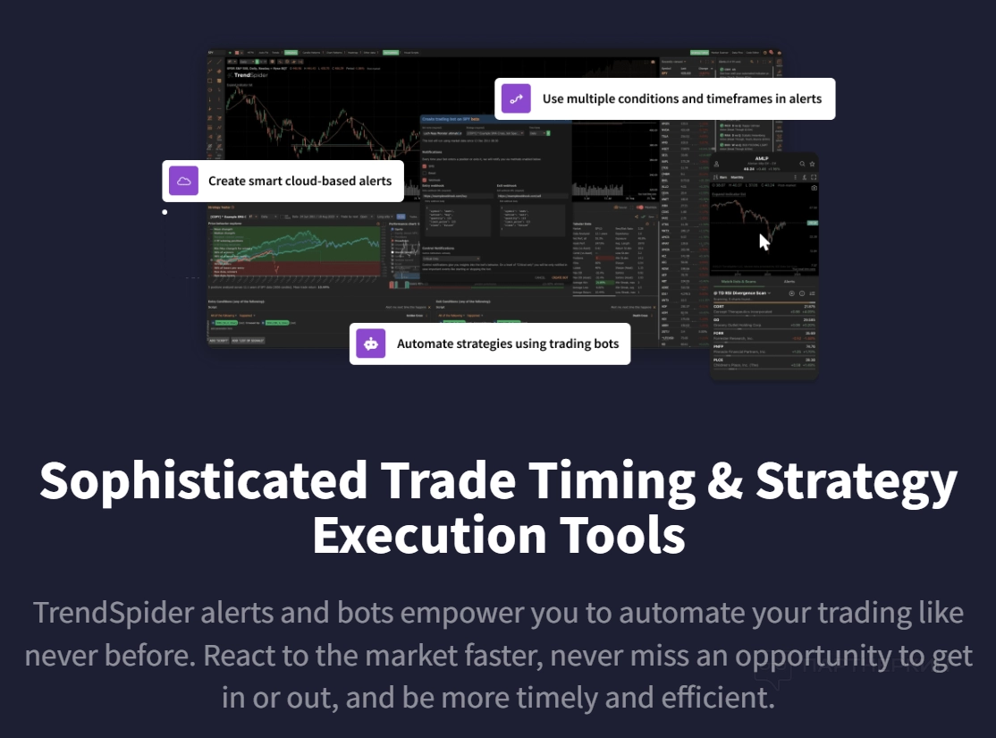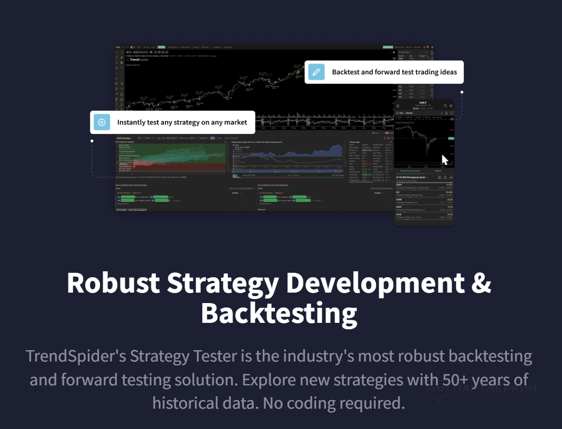 TrendSpiderпредлагает инструменты для разработки и тестирования стратегий без программирования. Простой интерфейс позволяет создавать стратегии, тестировать их на исторических данных и качественно оптимизировать. Визуализация на графиках и автоматизация через сигналы и ботов упрощают торговлю.