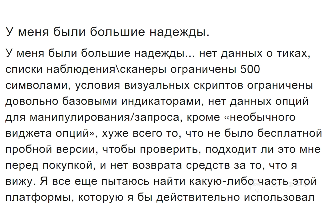 Но при этом пользователи довольны поддержкой и обучением, которые помогают лучше понять торговые процессы. Высоко оцениваются гибкость графиков и активность сообщества, делящегося настройками и обновлениями: