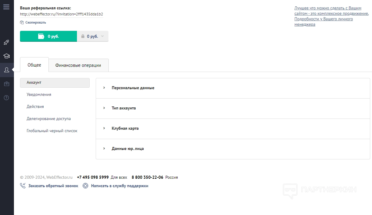 В разделе «Личный кабинет» собрана вся информация о пользователе, включая персональные данные, настройки уведомлений и доступы к проектам. Здесь же можно управлять финансовыми операциями, а также делегировать доступ другим пользователям.