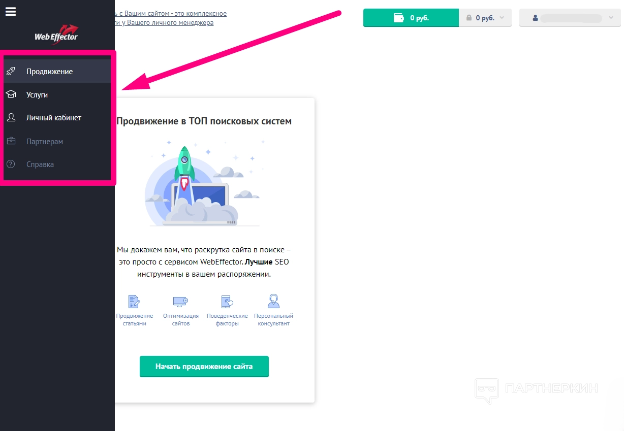 В левой части интерфейса размещено меню с ключевыми разделами, такими как «Продвижение», «Услуги», «Личный кабинет» и «Справка». Это позволяет легко управлять кампаниями и отслеживать состояние всех проектов.