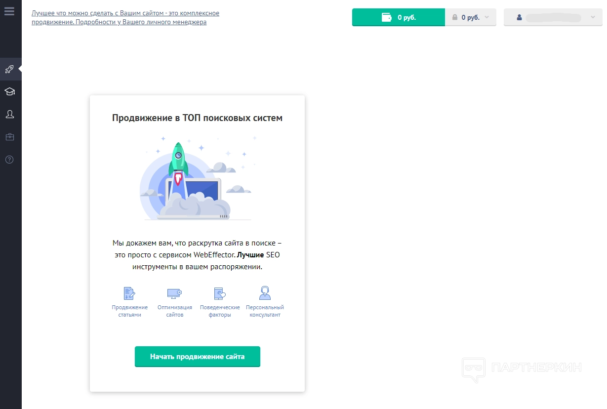 После регистрации на стартовом экране отображаются краткие рекомендации по дальнейшим шагам, включая запуск продвижения сайта с помощью инструментов платформы. Здесь же доступен обзор текущего состояния проектов.