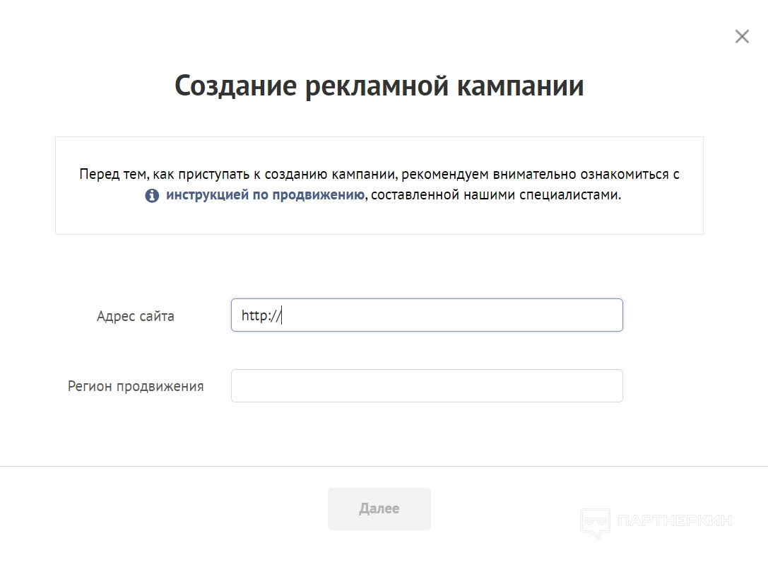 Для запуска нового проекта необходимо выбрать «Начать продвижение сайта», после чего нужно будет указать адрес сайта и регион продвижения.