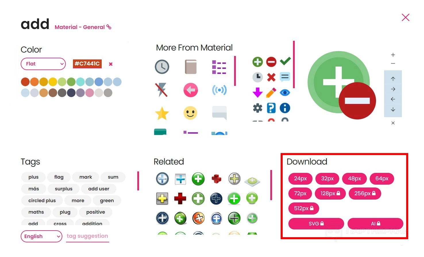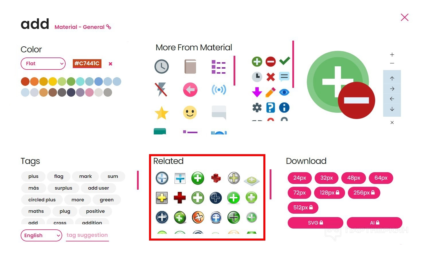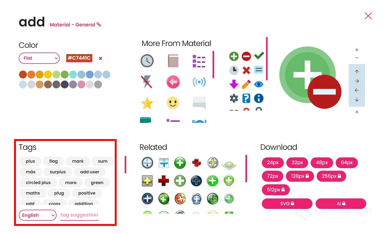 - Tags. Все теги, которые связаны с данным значком. Можно добавлять свои ключевые слова, но только через модерацию.