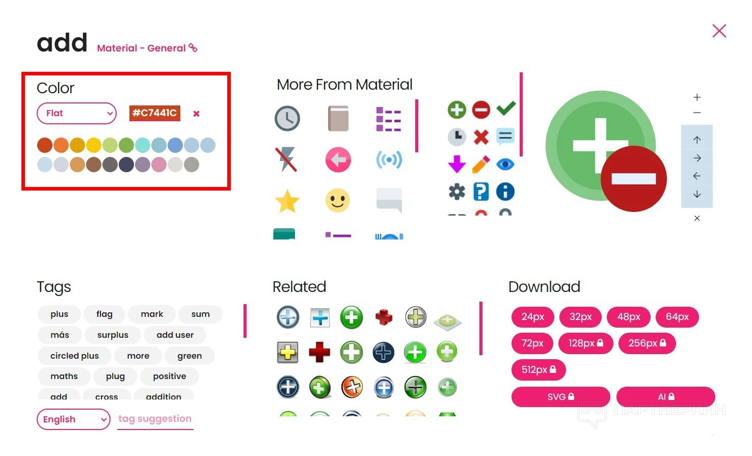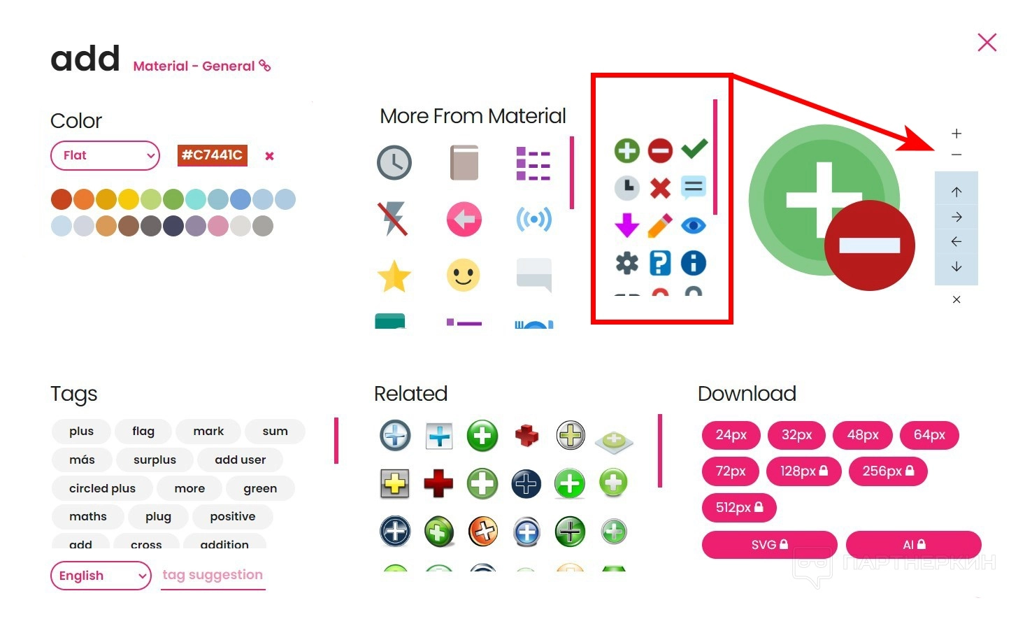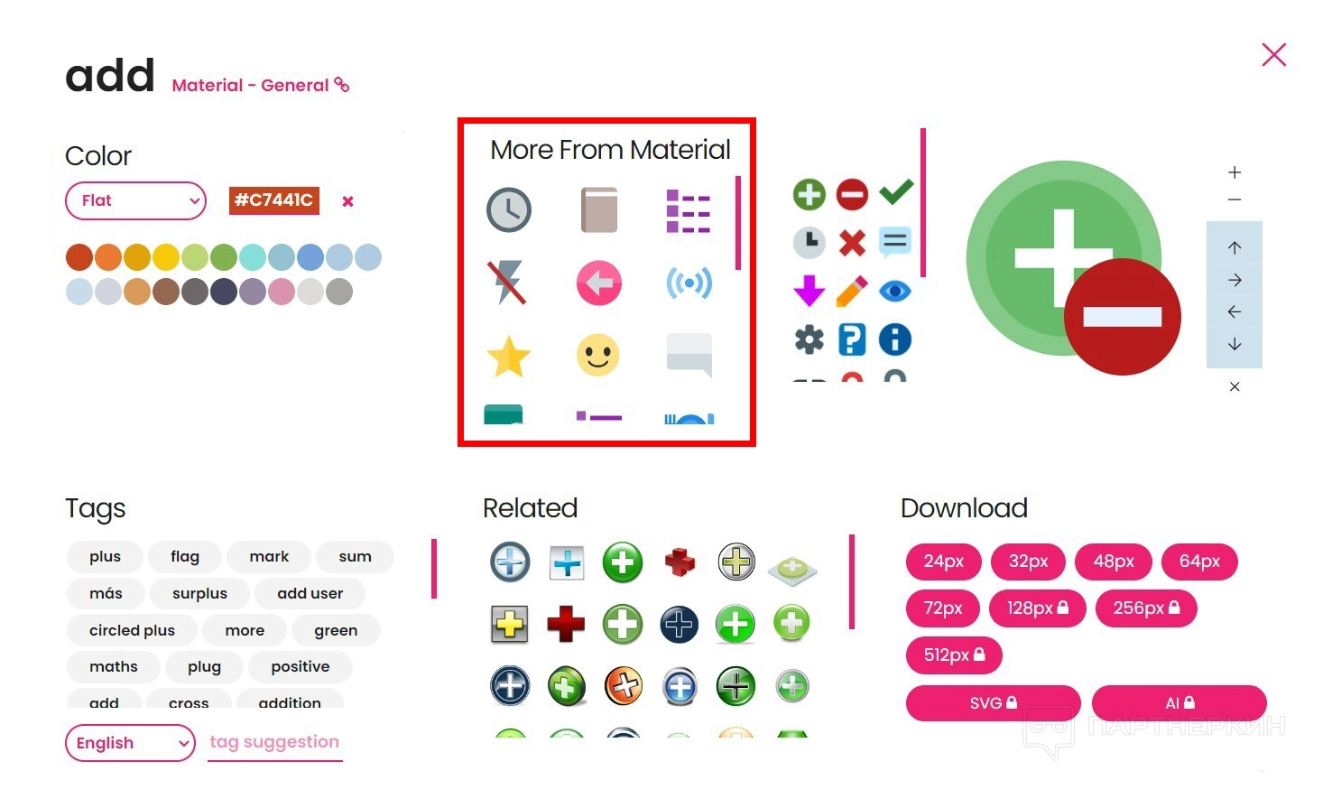 - Tags. Все теги, которые связаны с данным значком. Можно добавлять свои ключевые слова, но только через модерацию.