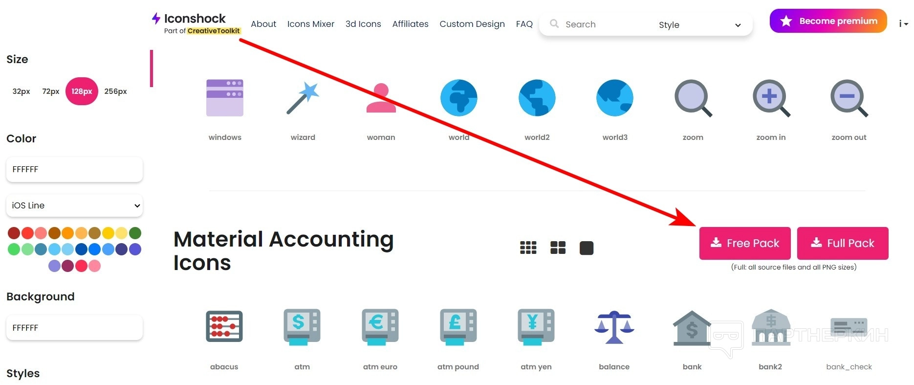 - Если вас все устраивает опуститесь вниз и найдите кнопки для скачивания. Free Pack загрузит только те иконки, которые вы выбрали и настроили (с максимальным размером — 72 px).
