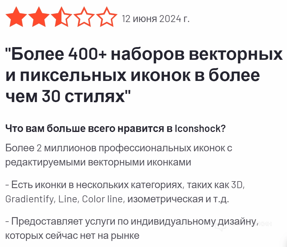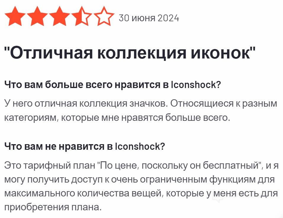 Один из пользователей хвалит сервис за обширную коллекцию иконок. Только он указывает на значительные ограничения бесплатного плана, которые мешают полноценному использованию сервиса без оформления платной подписки.