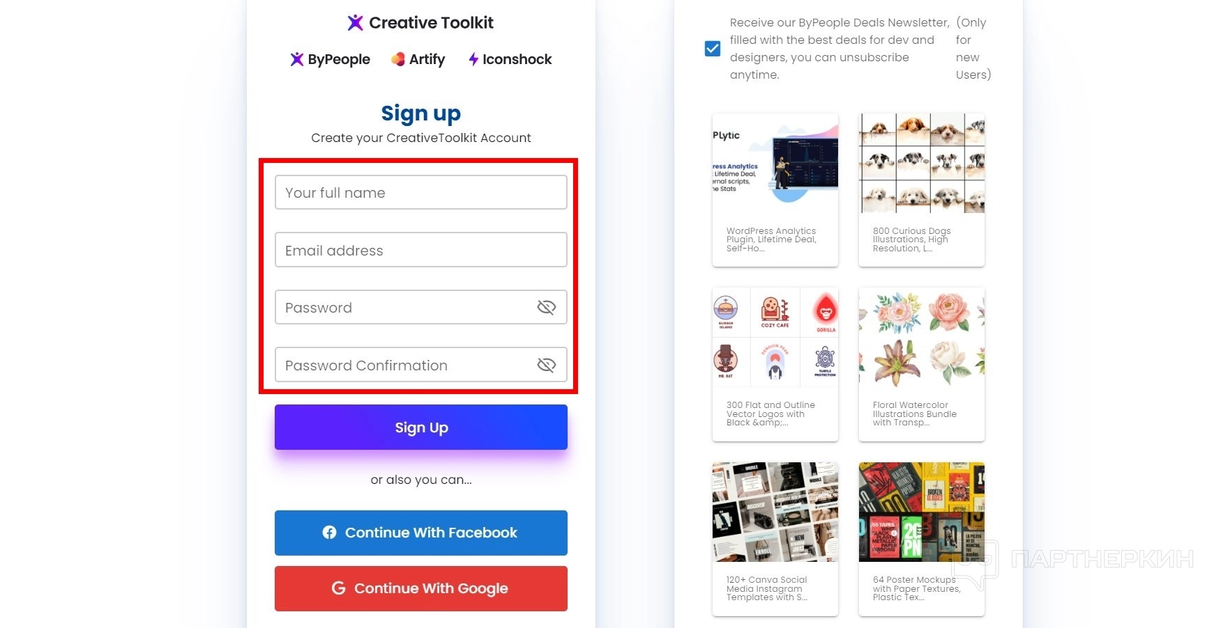 - Заполните регистрационную форму. Укажите ваше полное имя и email. Также придумайте пароль и повторите его.