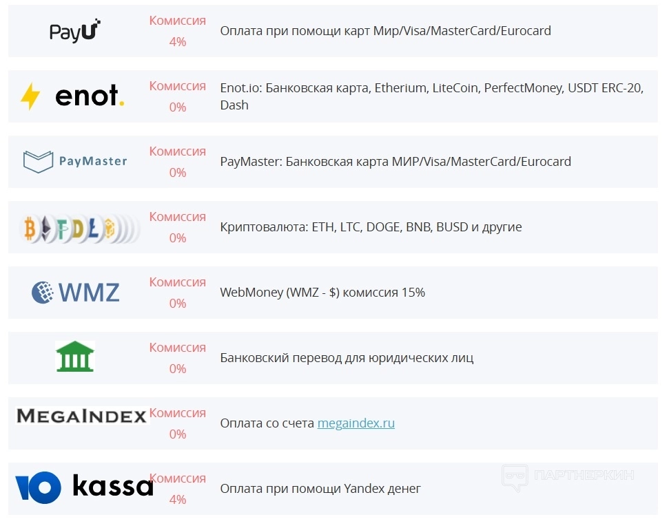 • Enot.io: банковская карта, Ethereum, LiteCoin, PerfectMoney, USDT ERC-20, Dash.