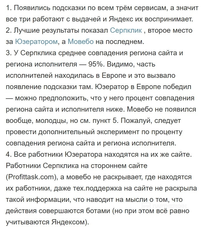 , проведенного специалистом AW-Valera и его командой из ALTWeb Group, было протестировано три популярных SEO-сервиса для улучшения поведенческих факторов: Юзератор, Мовебо и SERP Click. Целью было выяснить, какой из сервисов показывает наилучшие результаты с точки зрения появления подсказок в поисковой выдаче.