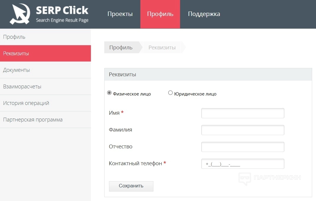 В разделе «Профиль» вы можете заполнить свои реквизиты и указать статус — физическое лицо или компания. Это важно для правильного отображения расчетов и выставления счетов.