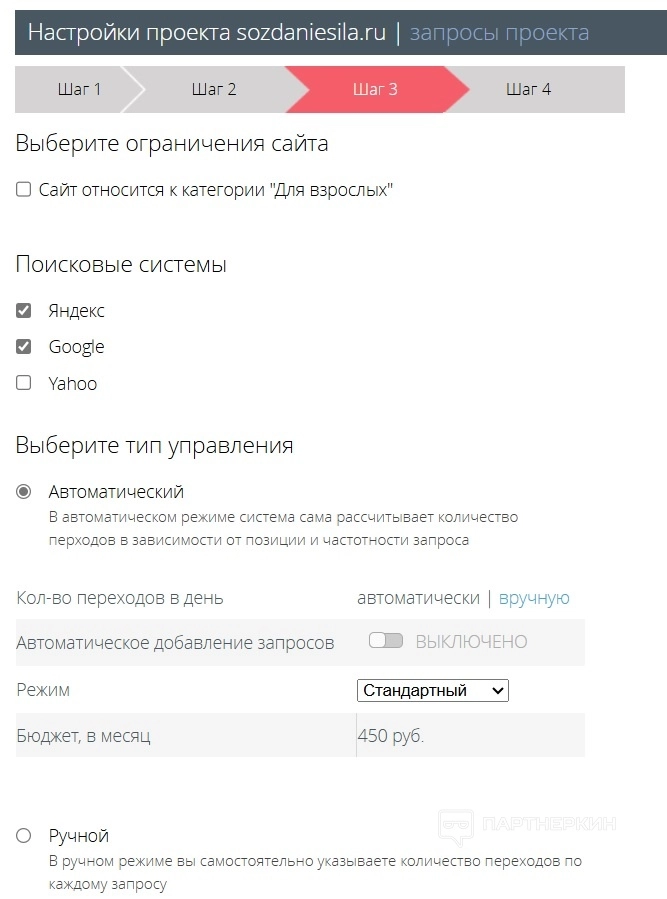 1. Настройте параметры: выберите поисковую систему (Яндекс или Google), задайте количество переходов в день, режим работы, бюджет и другие параметры.