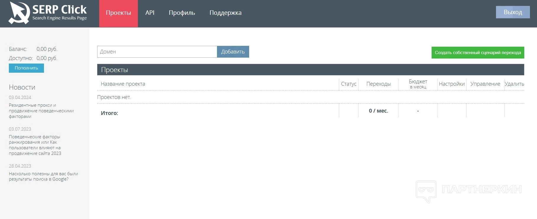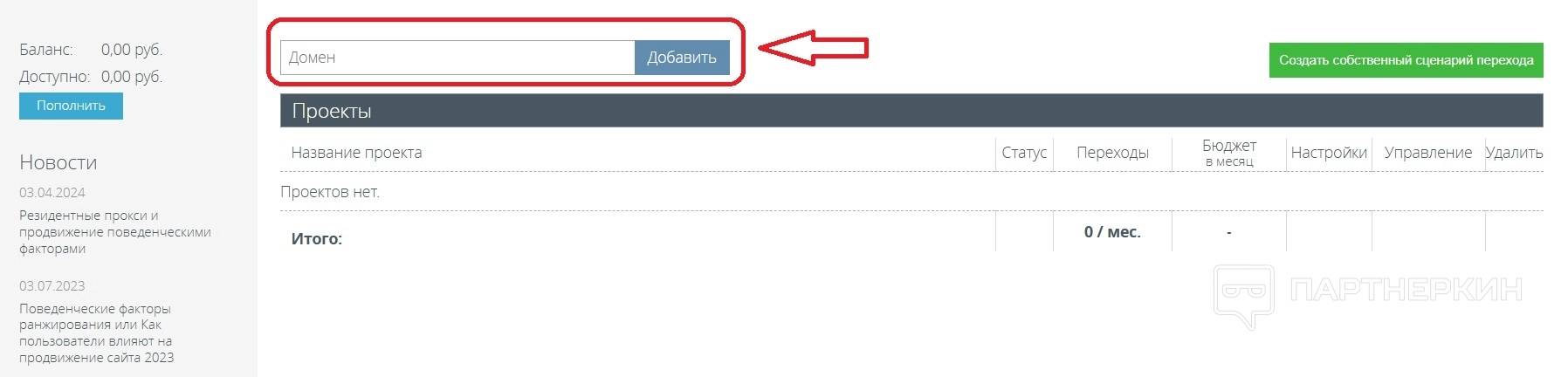 В личном кабинете можно добавить свой сайт (домен) и настроить сценарии для выполнения заданий на улучшение поведенческих факторов. Вся статистика по вашему сайту будет отображаться на главной странице личного кабинета, где вы увидите информацию о статусе, переходах и бюджете.