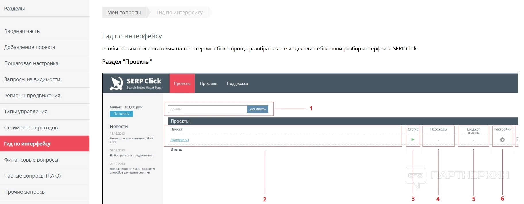 • Мои вопросы : здесь отображаются все ранее заданные вами вопросы сотрудникам SERP Click. Это удобно для отслеживания статуса обращения или поиска ответа на часто задаваемые вопросы.