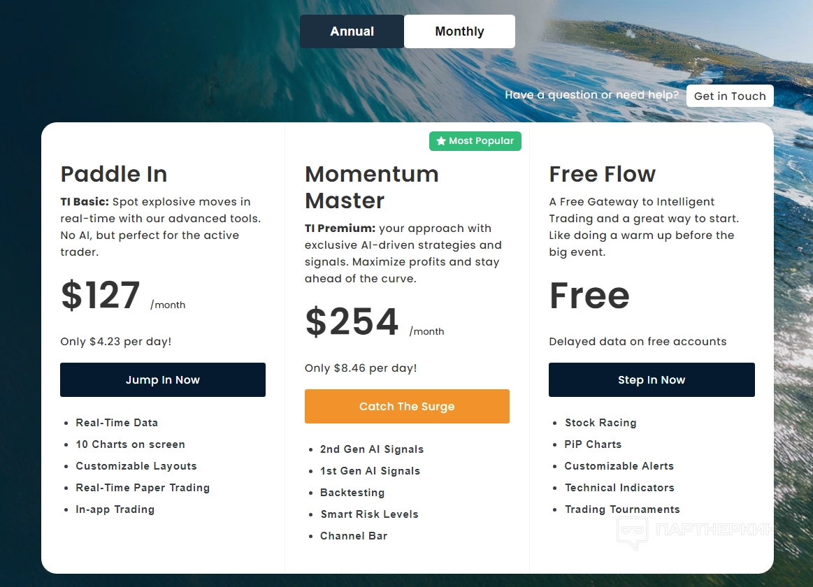 Платные тарифы включают Paddle In (TI Basic) за $127 в месяц и Momentum Master (TI Premium) за $254 в месяц. Первый предоставляет базовые функции для активных трейдеров, включая данные в реальном времени и возможность отображать до 10 графиков. Второй предлагает более продвинутые возможности на базе ИИ, такие как сигналы ИИ и тестирование стратегий, что делает его подходящим для профессионалов.