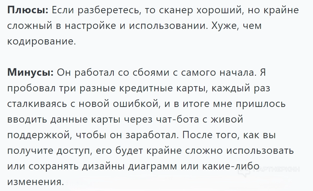 Есть мнения, что несмотря на хорошие возможности сканирования акций, интерфейс сложен в настройке, а процесс оплаты вызывает затруднения. Некоторые пользователи столкнулись с техническими сбоями при вводе данных для оплаты, что потребовало вмешательства службы поддержки: