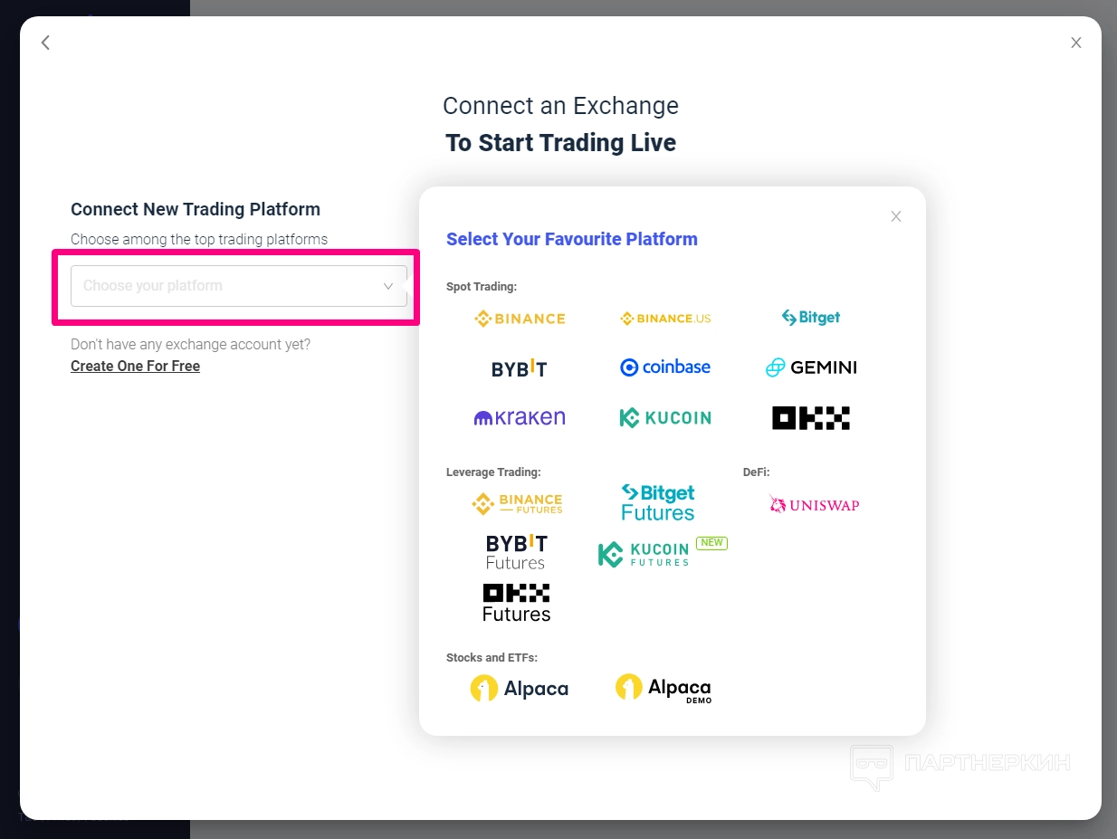 После регистрации или входа пользователи могут начать торговлю, подключив свои аккаунты на поддерживаемых криптобиржах. Пользователю необходимо просто выбрать нужную биржу в выпадающем меню на странице подключения: