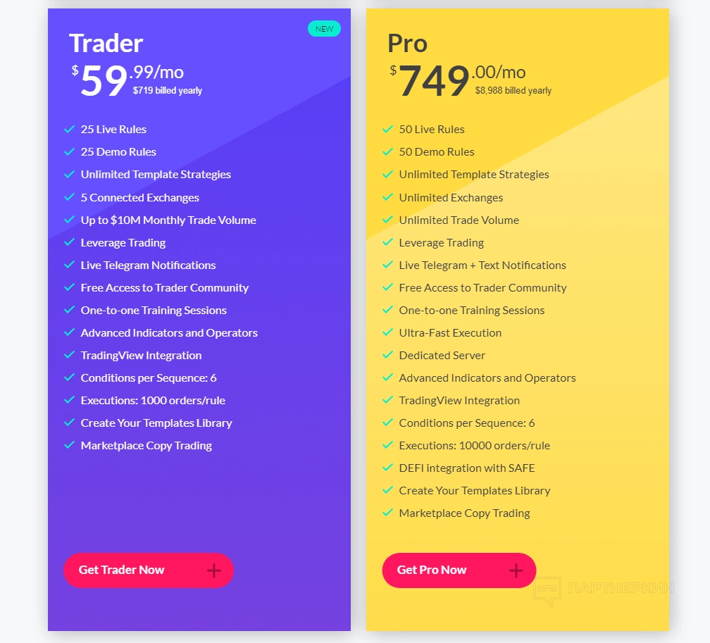 - Trader ($59.99 в месяц или $719 в год). План предоставляет 25 живых правил, 25 демо-правил, неограниченное количество стратегий и до 5 подключенных бирж. Также предлагаются такие функции, как интеграция с TradingView, и возможность создавать до 1000 ордеров на одно правило. Объем торговли увеличен до $10 миллионов в месяц.