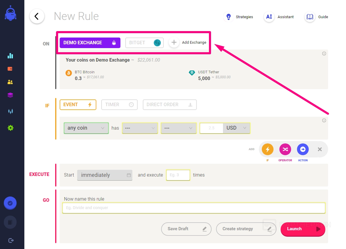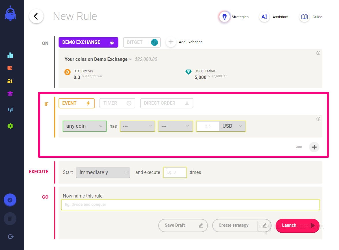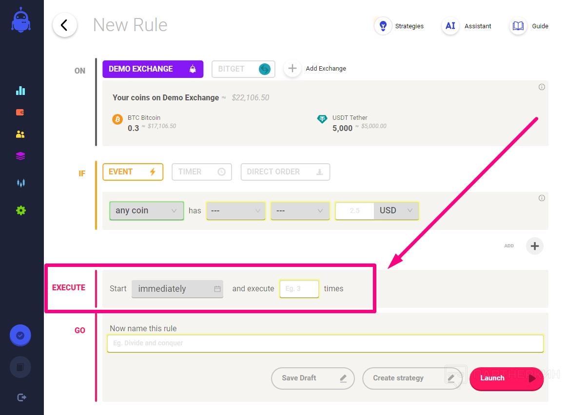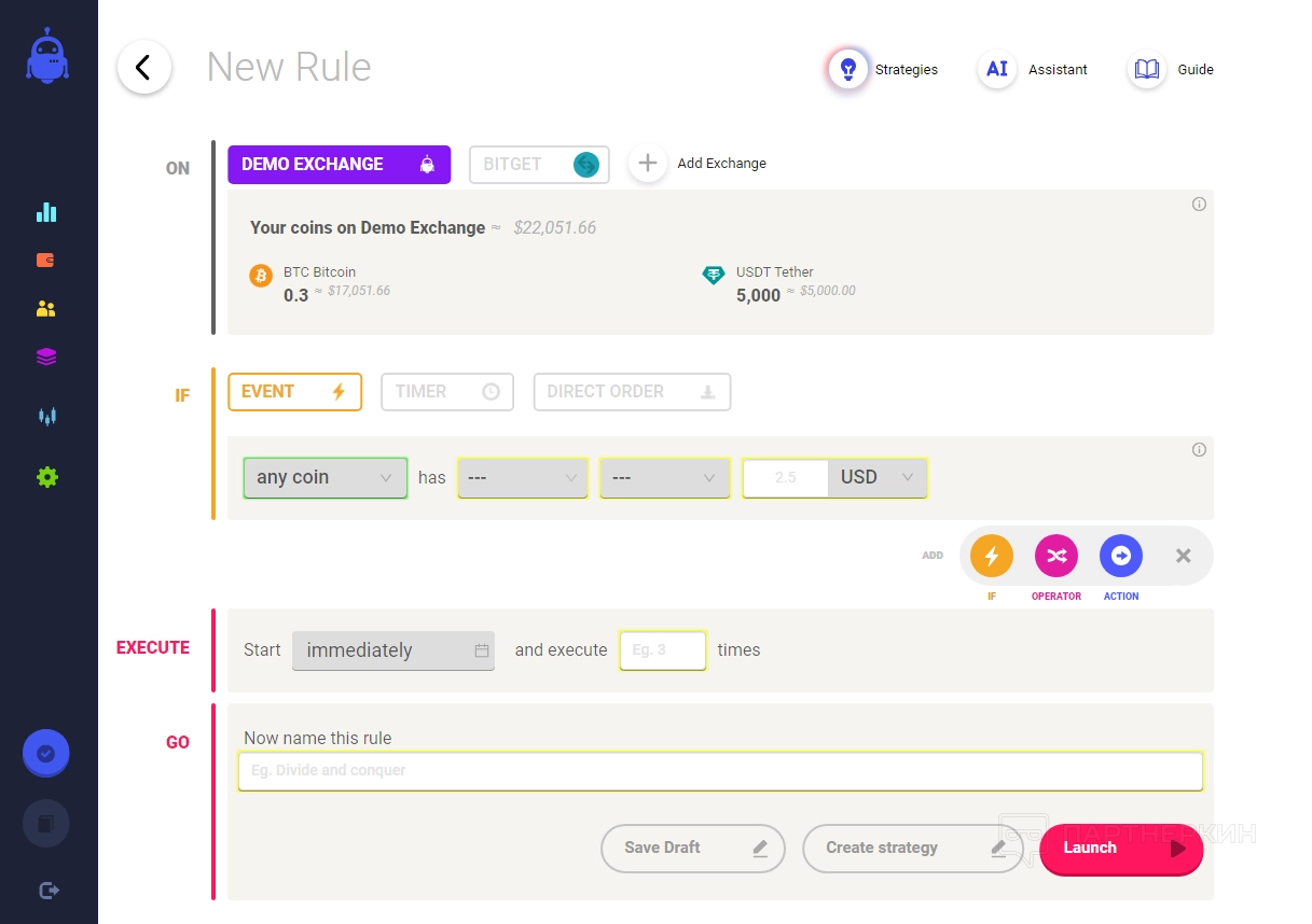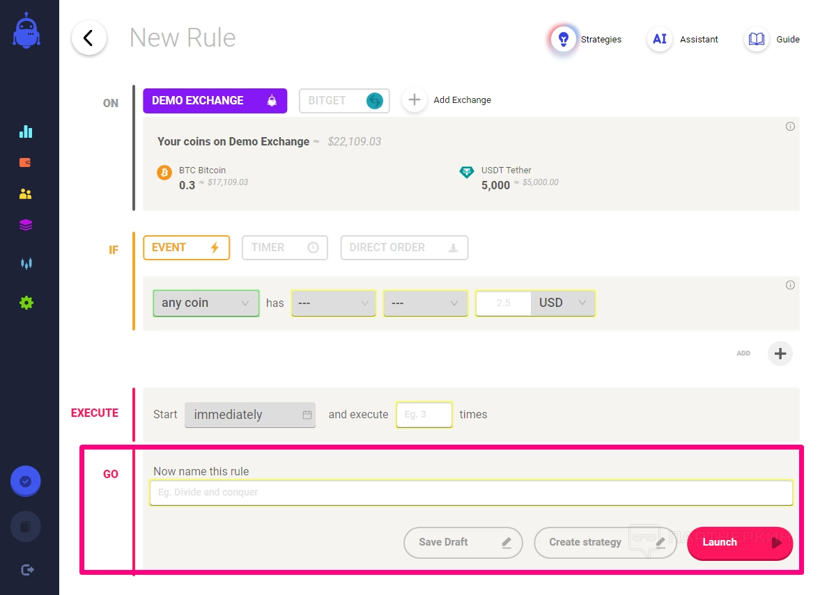 Ниже в разделе GO необходимо придумать название для стратегии, чтобы её можно было легко идентифицировать в будущем. После завершения всех настроек можно сохранить правило как черновик (Save Draft) или сразу запустить стратегию, нажав кнопку «Launch»: