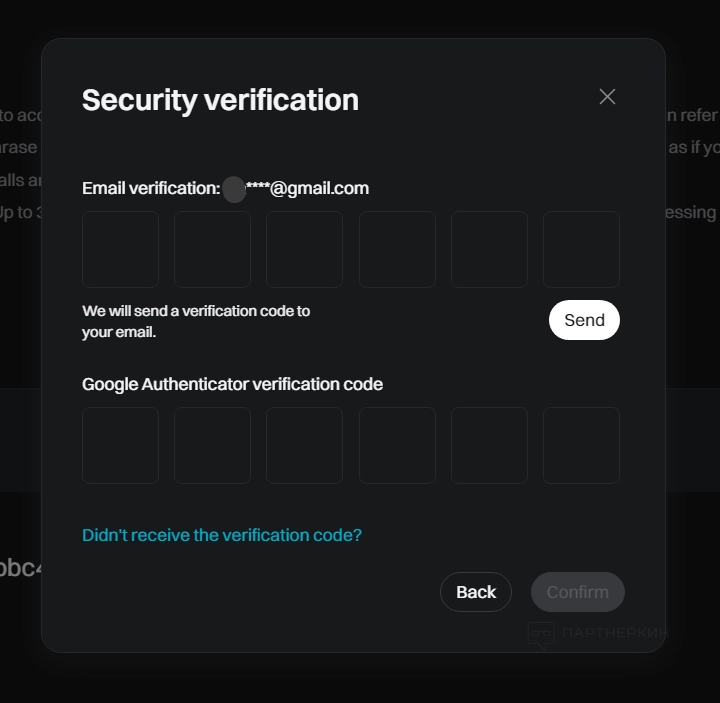 Следующий важный шаг — это верификация безопасности. Здесь требуется подтверждение по электронной почте, а также ввод кода из приложения Google Authenticator: