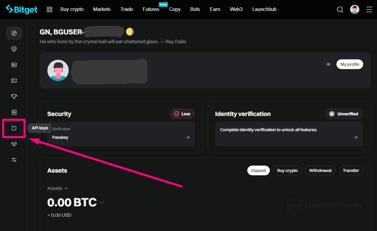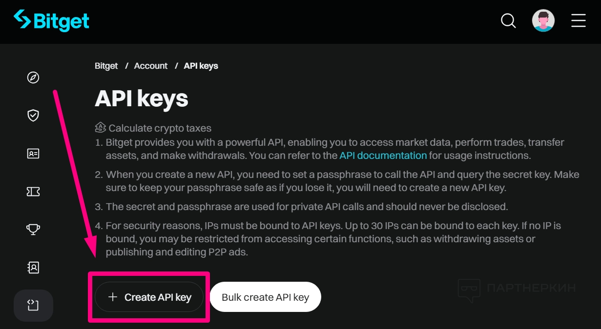 Эти данные можно получить в разделе управления на самой бирже. Например, для создания ключа на бирже Bitget, пользователю необходимо зайти в раздел «API-ключи», где можно управлять уже существующими ключами и создавать новые: