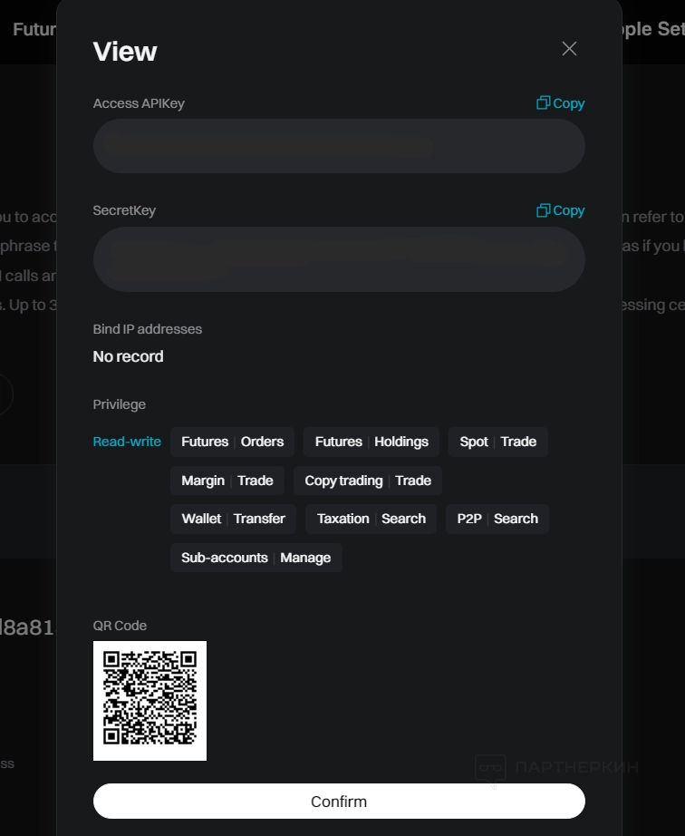 - API-ключ — уникальный идентификатор, который предоставляет биржа для взаимодействия с внешними приложениями.