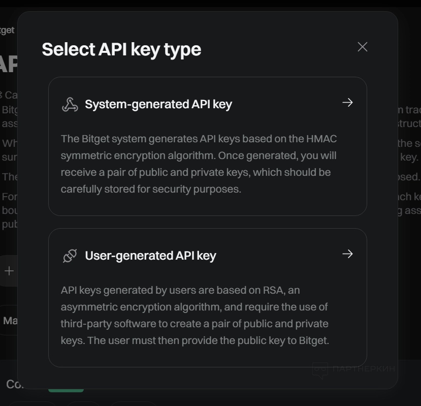 Для создания нового ключа нужно нажать на кнопку «Create API Key», после чего откроется новое окно, в котором потребуется выбрать тип API-ключа: