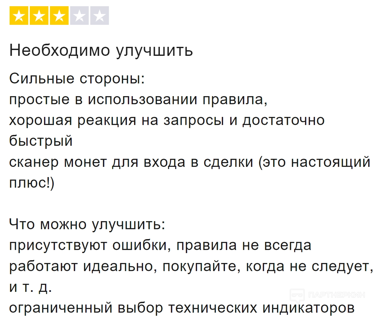 Однако пользователи также указывают на необходимость улучшений. Несмотря на простоту использования правил, время от времени случаются ошибки в их исполнении. Трейдеры жалуются, что иногда платформе не удается корректно выполнить покупку или продажу в нужный момент, что может повлиять на результат торговли. Также пользователи отмечают, что технических индикаторов на платформе недостаточно для более сложного анализа: