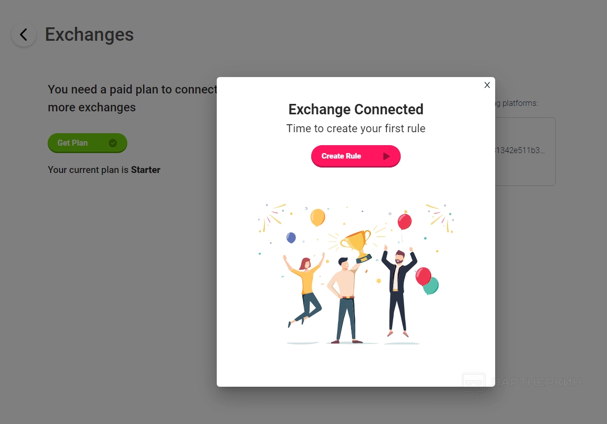 - Starter (бесплатный). Включает 2 живых правила и 2 демо-правила для тестирования стратегий, доступ к 7 готовым стратегиям и возможность подключить одну биржу. Однако объем торговли ограничен $3000 в месяц, а количество ордеров на одно правило — 30. Это хороший выбор для новичков, которые хотят попробовать автоматизацию торговли без вложений.