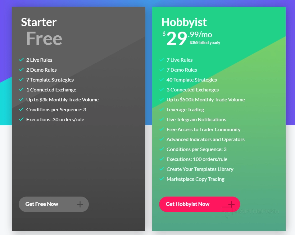 - Hobbyist ($29.99 в месяц или $359 в год). Пользователям доступны 7 живых и 7 демо-правил, 40 готовых стратегий и возможность подключить до 3 бирж. Объем торговли увеличен до $500,000 в месяц, а также добавлены уведомления через Telegram.