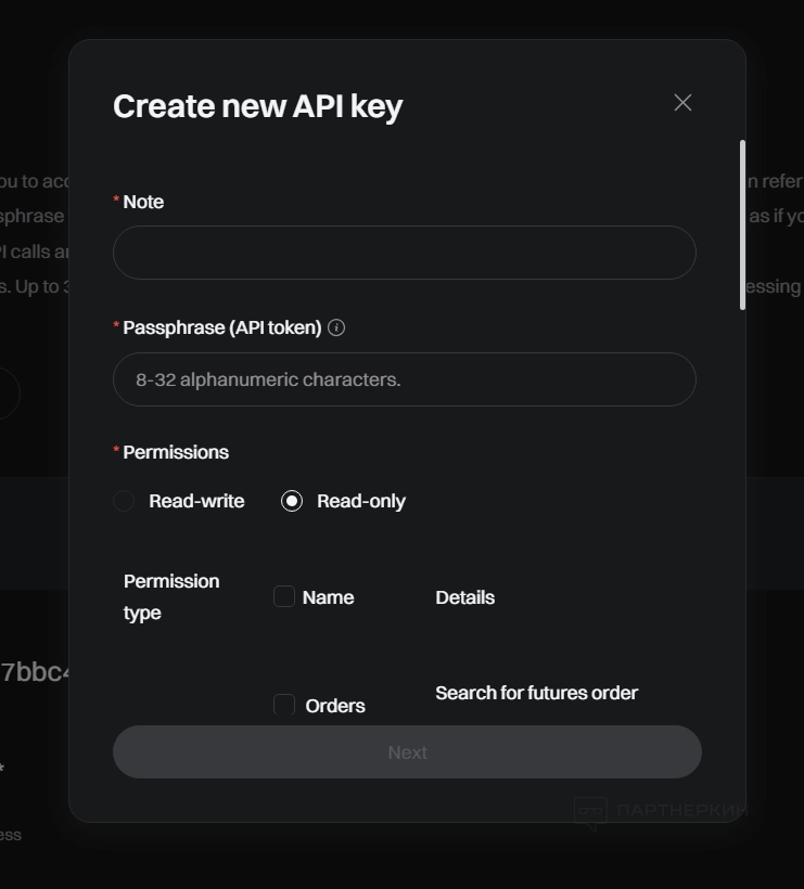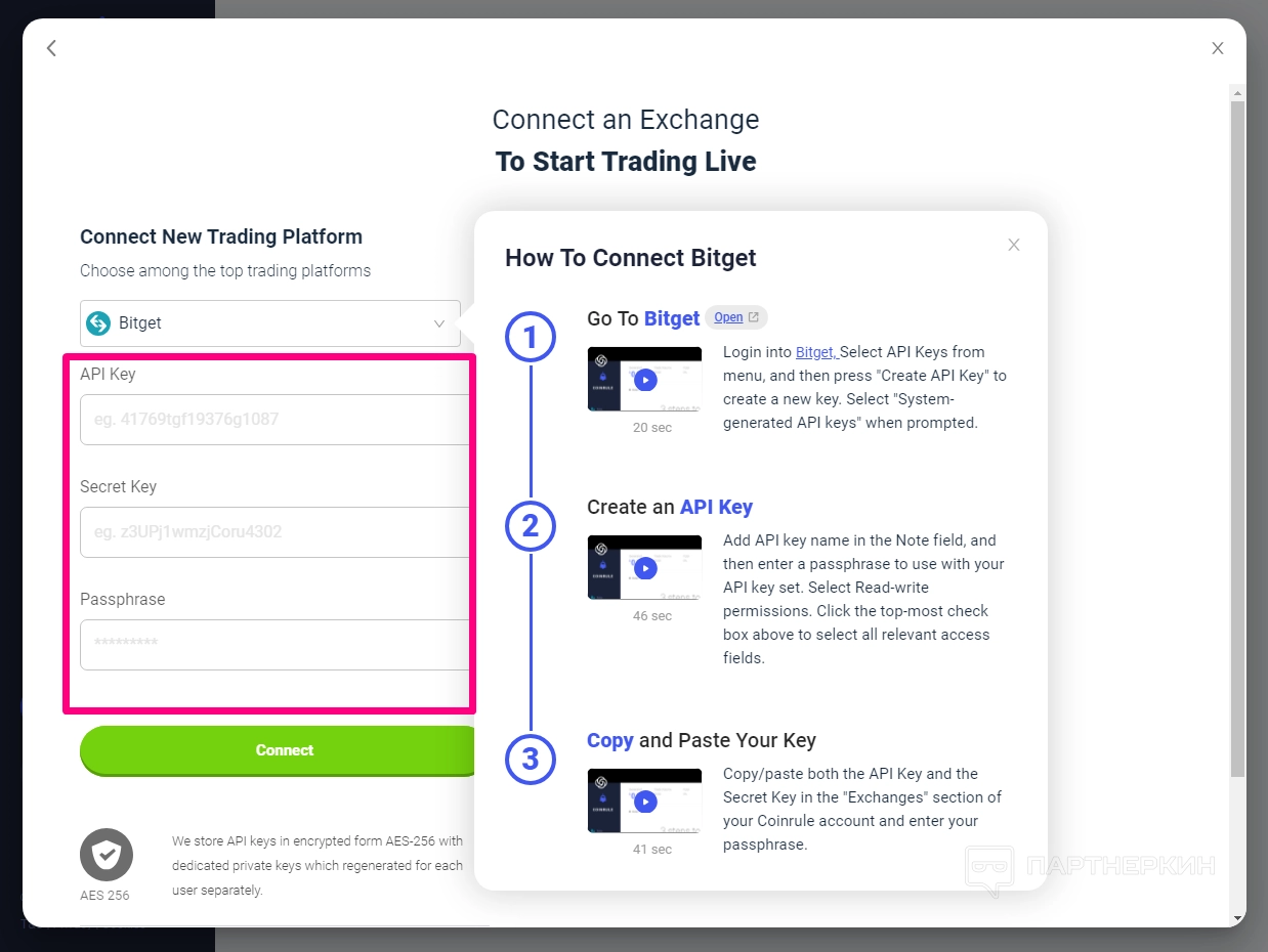 После выбора биржи появляется новое окно для ввода данных API. Для безопасного подключения к бирже необходимо ввести следующие данные: