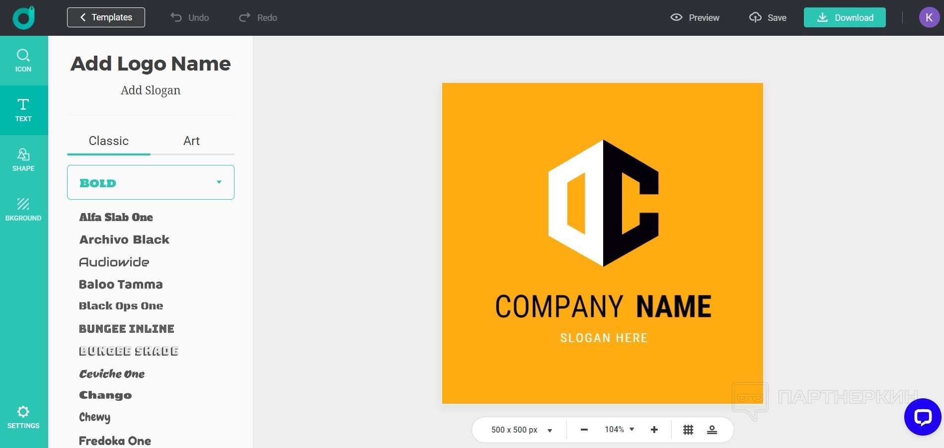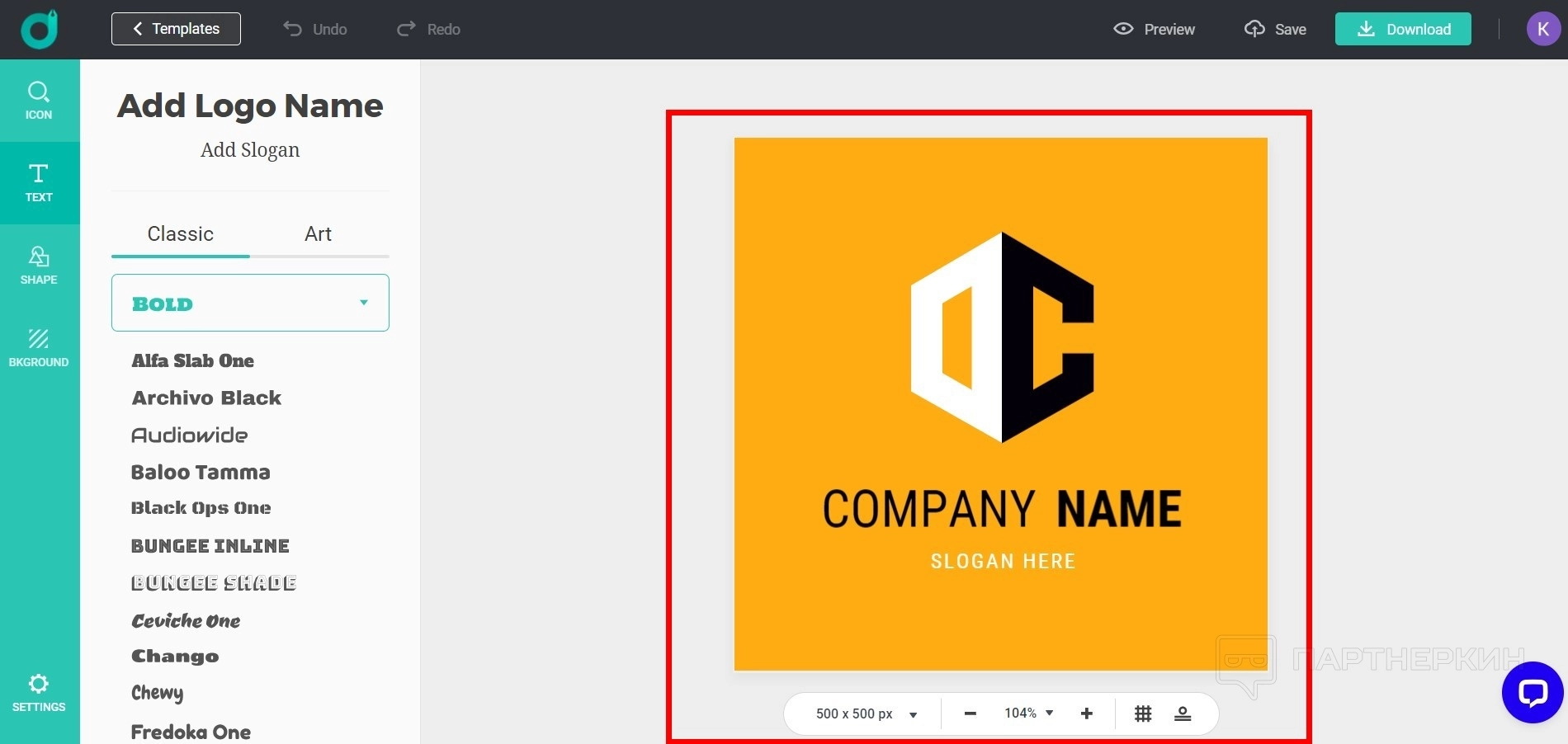 - Prewiew. Предпросмотр логотипа. Инструмент отличается от привычных опций у аналогичных сервисов. Пользователь сможет посмотреть, как будет выглядеть логотип в разных вариациях: на визитках, веб-сайте, футболке и так далее.