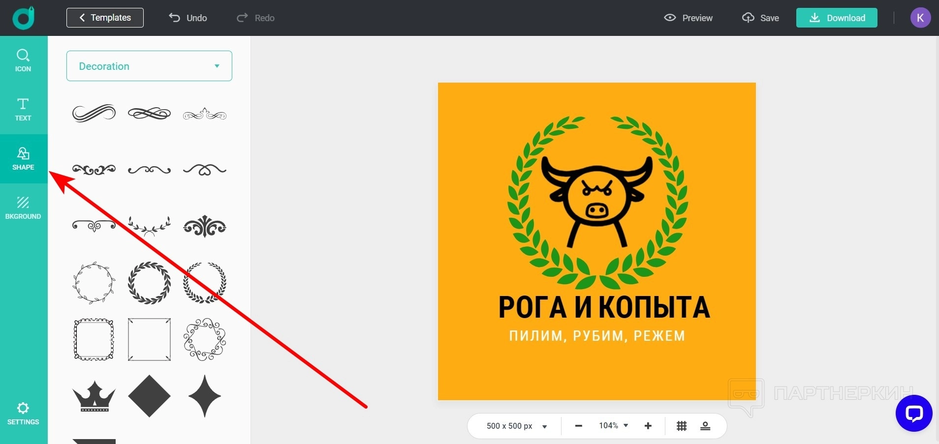 Для удобства раздел делится на несколько категорий: значки, украшения, линии, баннер и так далее. Как и иконки, цвет, размер, положение фигур можно менять.