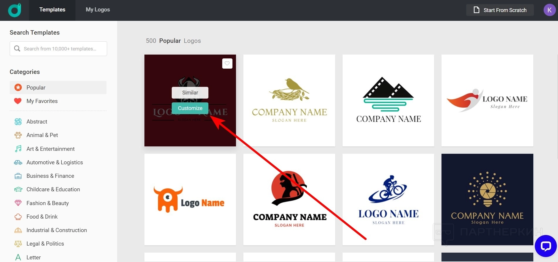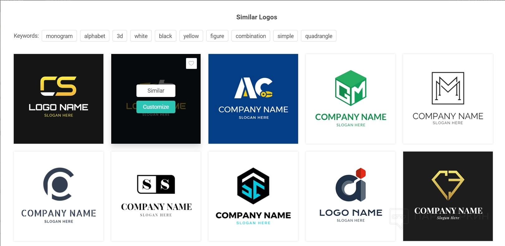 Особого внимания заслуживает функция Customize , доступная при наведении курсора на миниатюру логотипа. При нажатии на эту кнопку пользователи могут увидеть другие логотипы, схожие по стилю с выбранным вариантом.