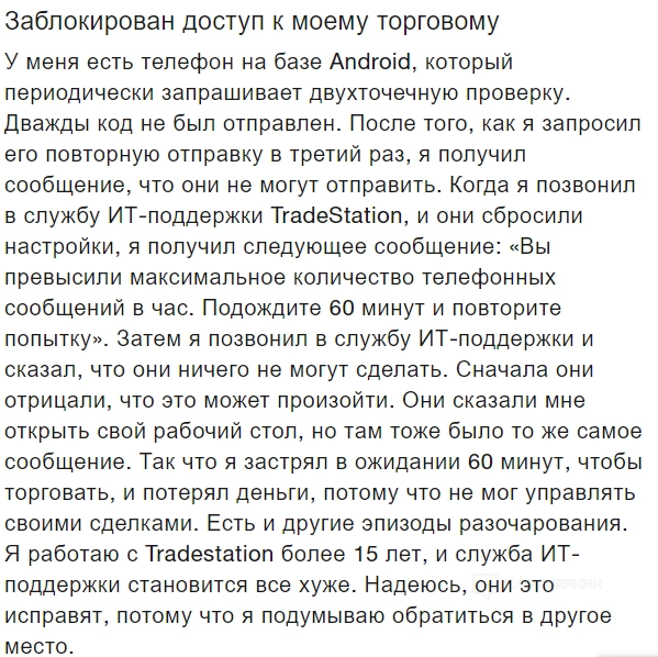 Один из пользователей жалуется на проблемы с получением кода для двухфакторной аутентификации на Android-устройстве, что привело к задержке в торговле. Служба поддержки не смогла помочь, и это вызвало недовольство из-за упущенной возможности торговать.