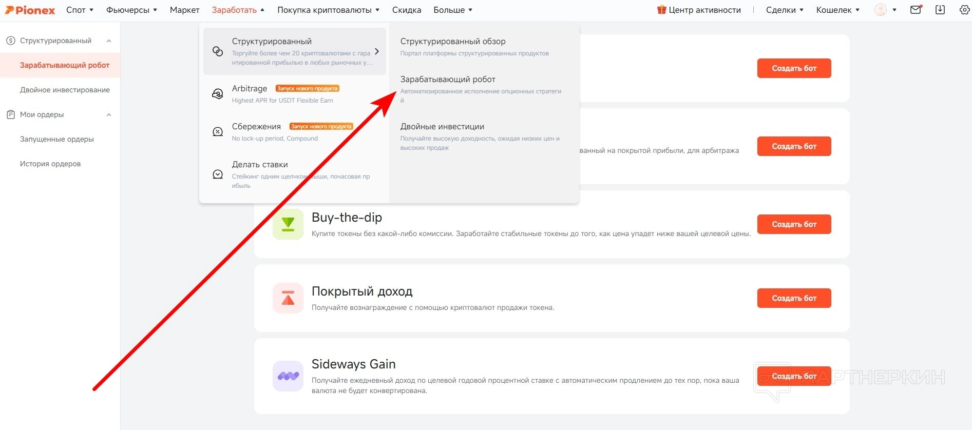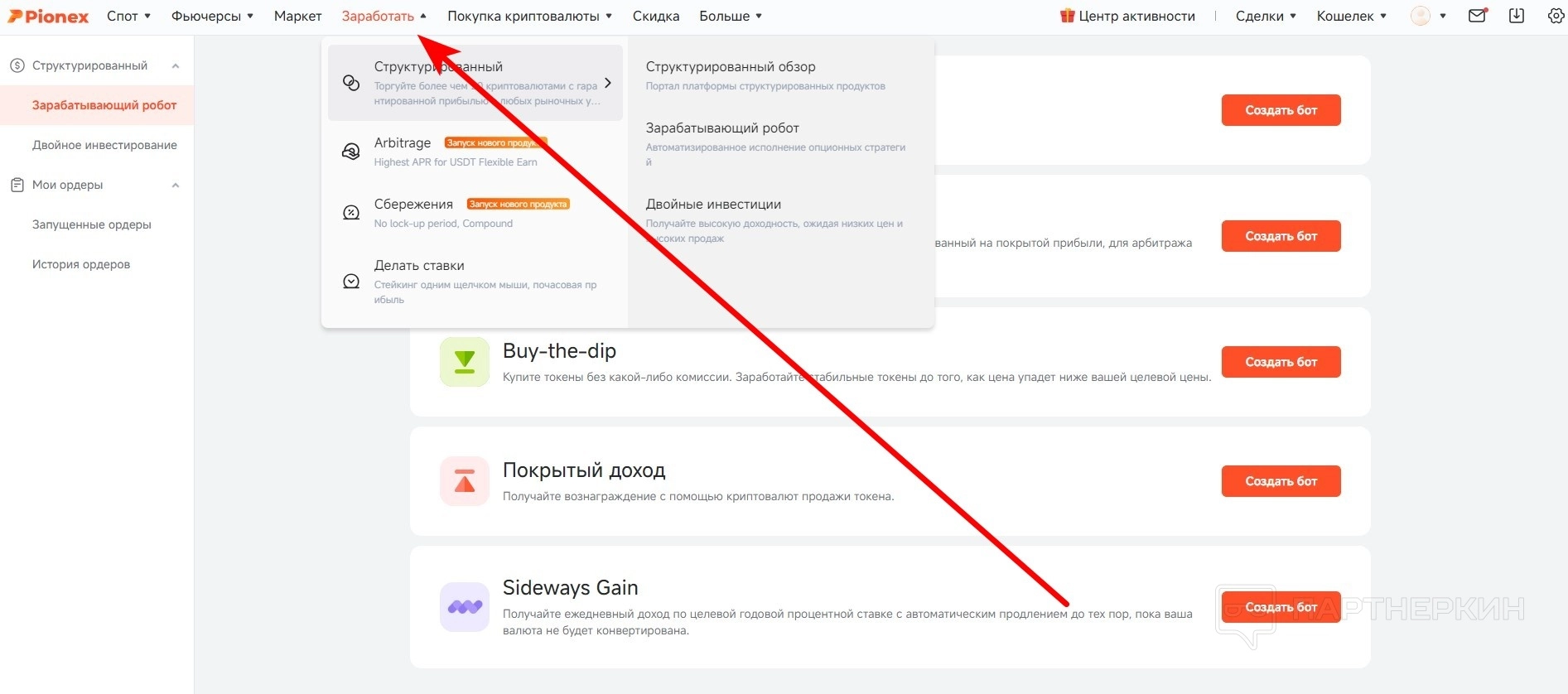 - Заработать. Возможность делать ставки, чтобы повысить свой доход. Состоит из структурированных стратегий, арбитража, торговли криптой и других ставок.