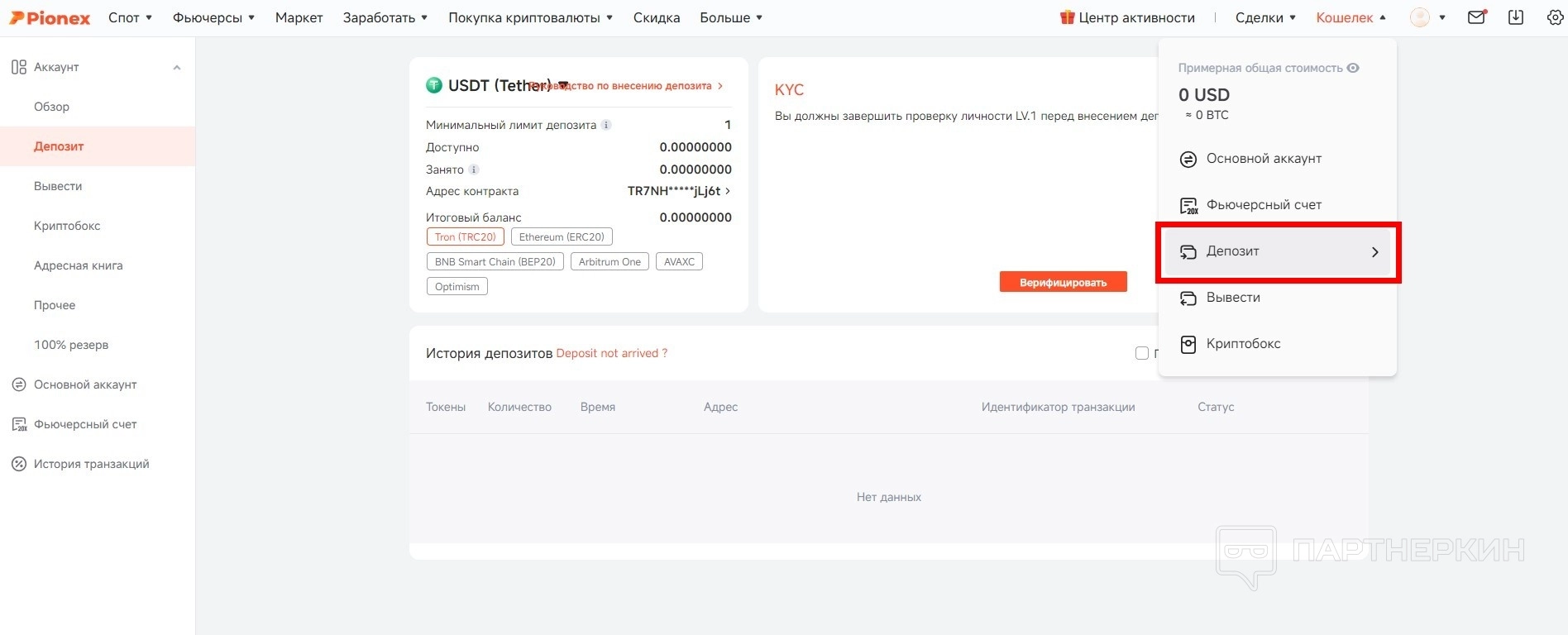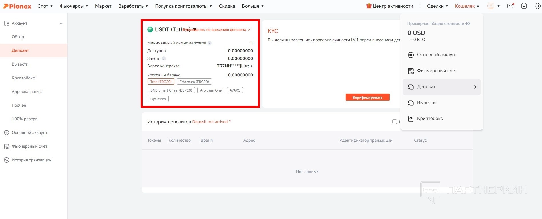 - С левой стороны выберите монету (токен) и сеть, где валюта располагается.