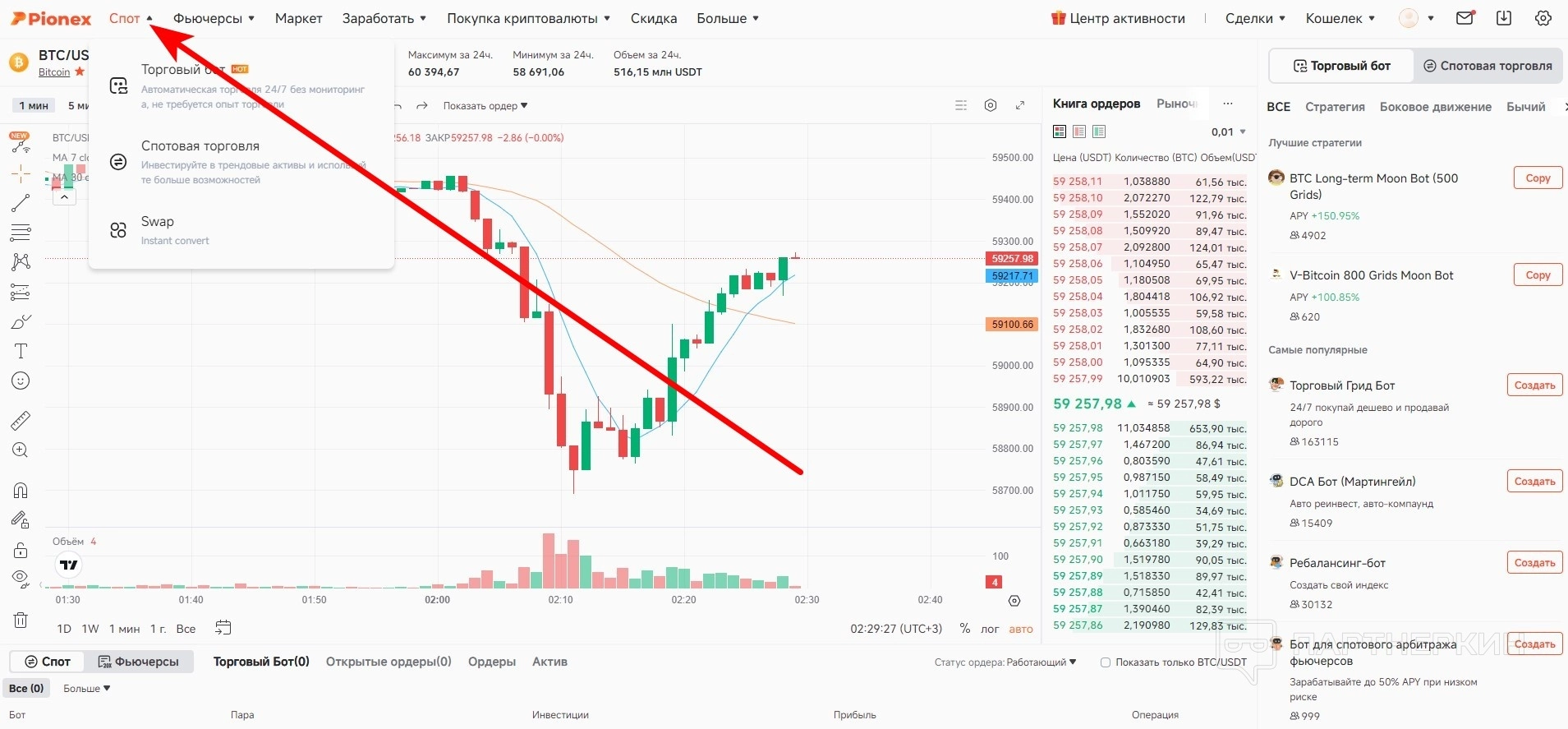 - Спот. Включает все опции для данной торговли. Состоит из следующих разделов: бот для спот-торговли, ручная спот-торговля, Swap (обмен криптой).