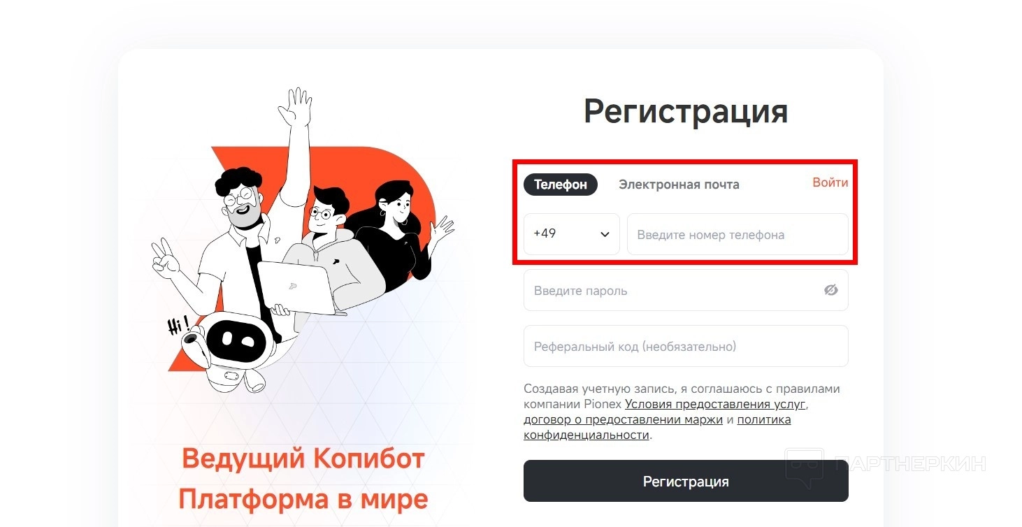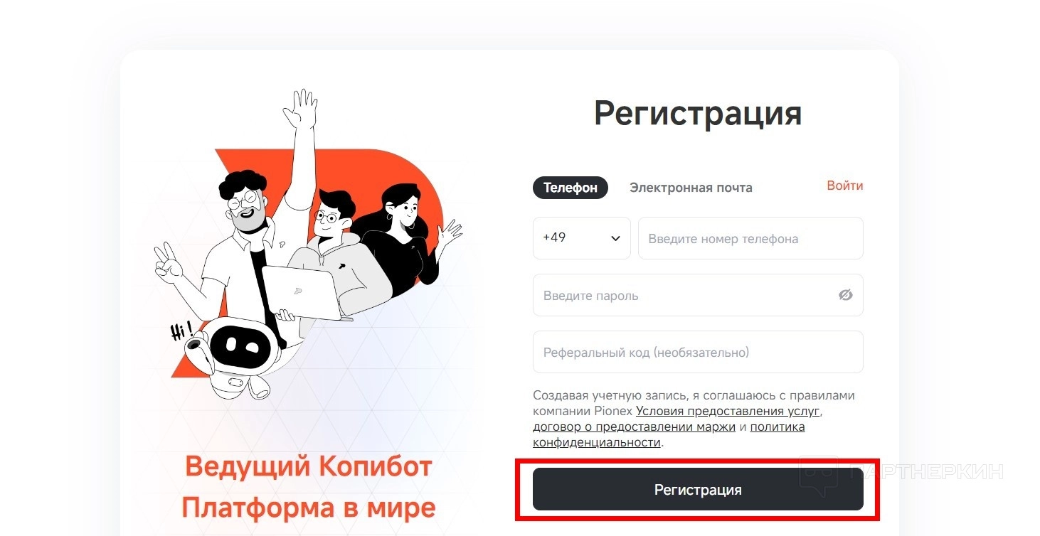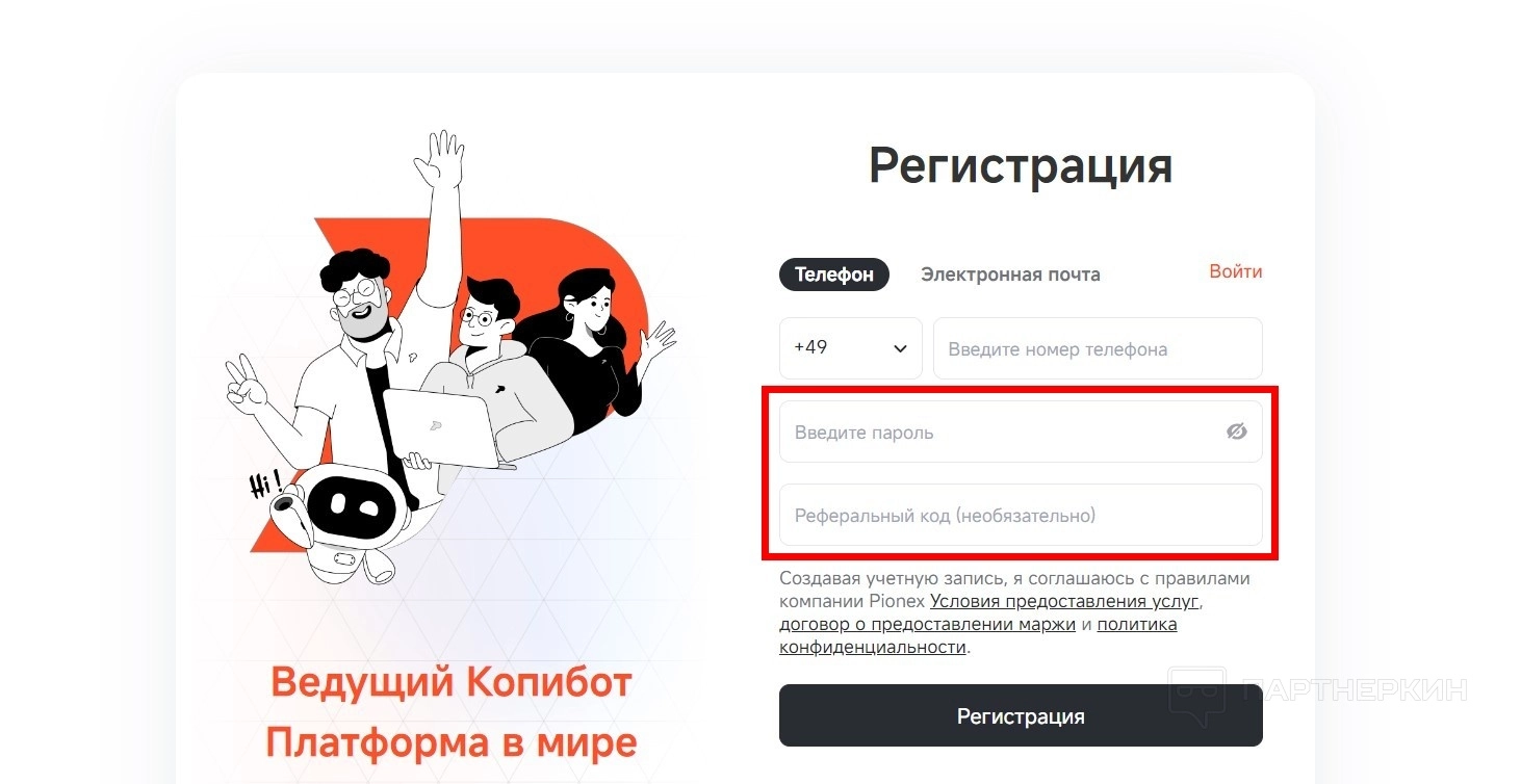 - Придумайте пароль и укажите реферальный код (если он есть).