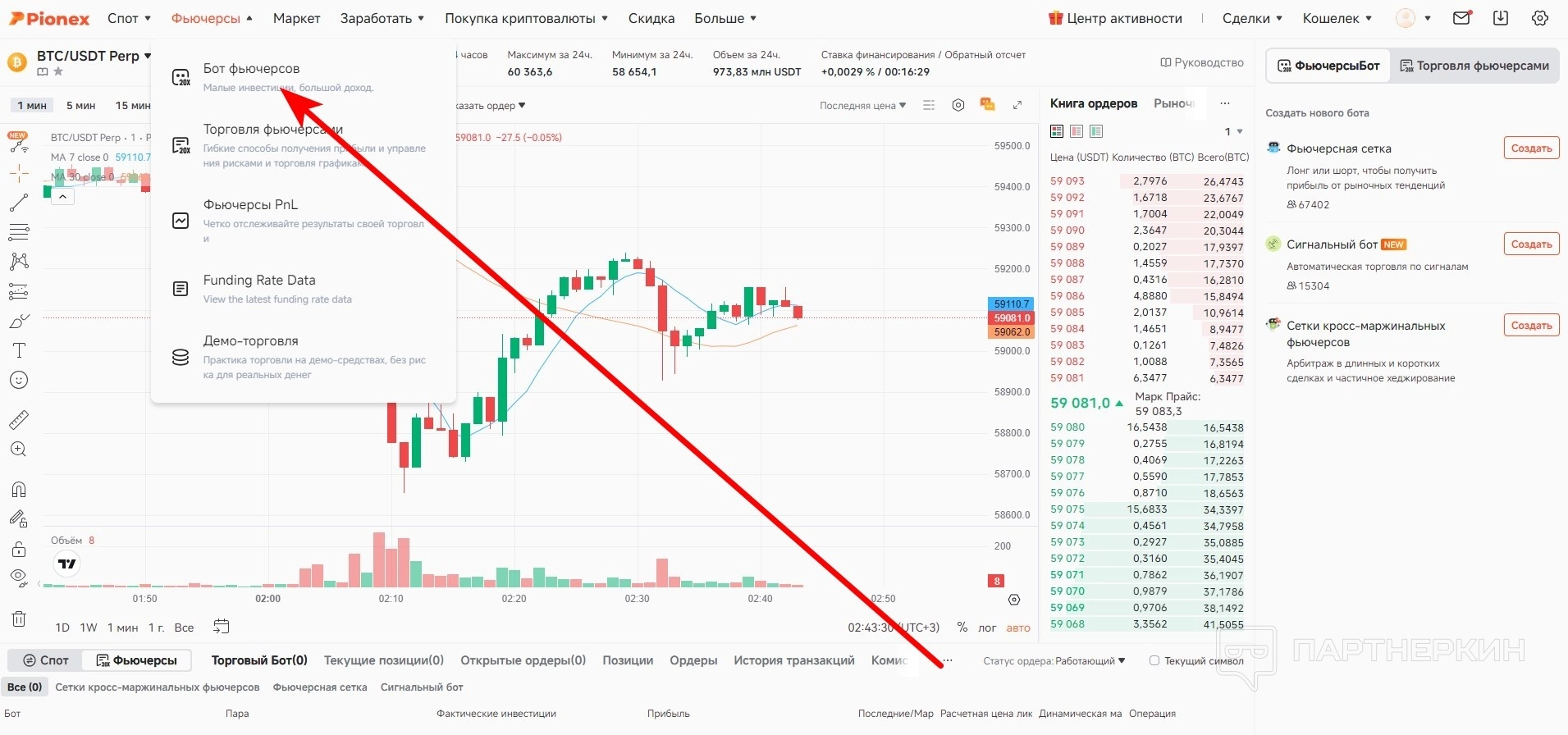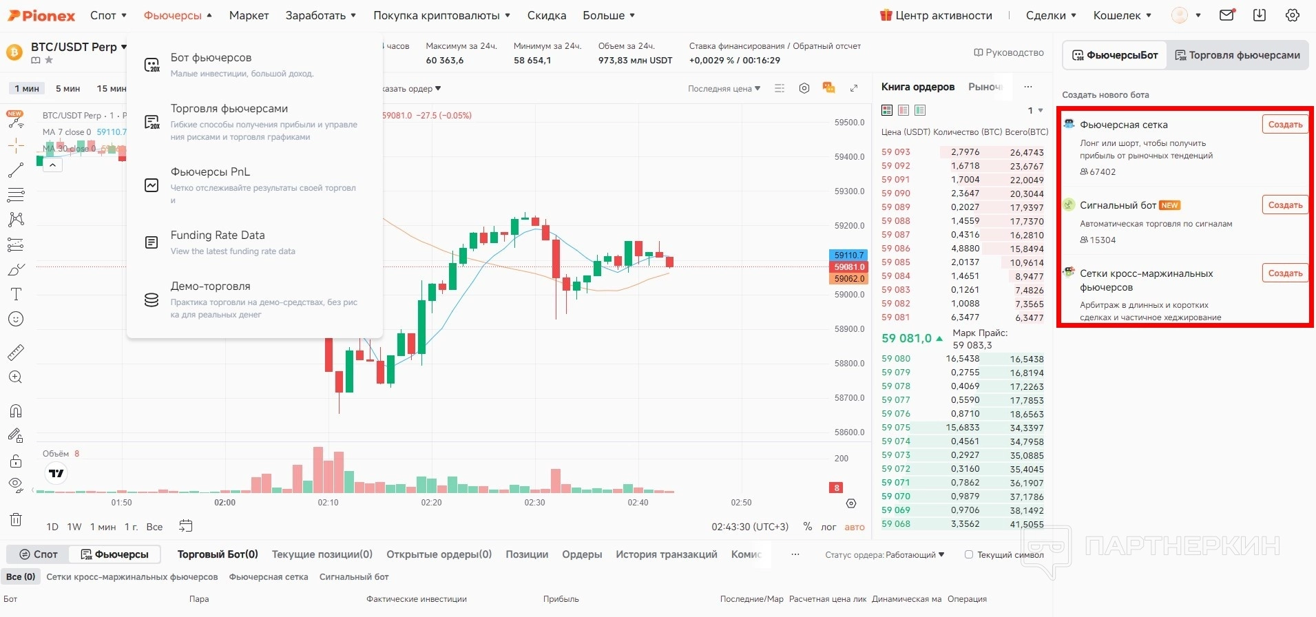 - Фьючерсы. Контрактная торговля, где также есть боты. Также несколько вариантов фьючерсов и демо-торговля.