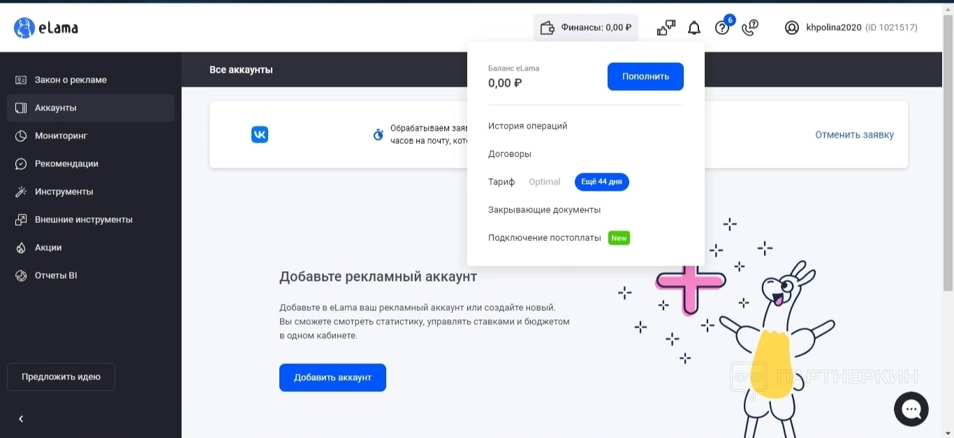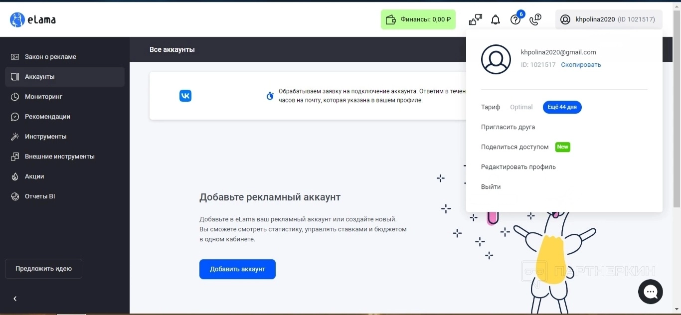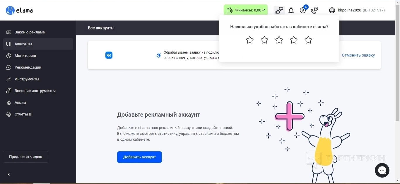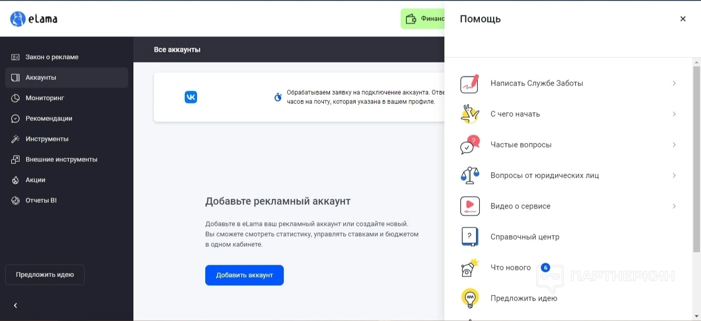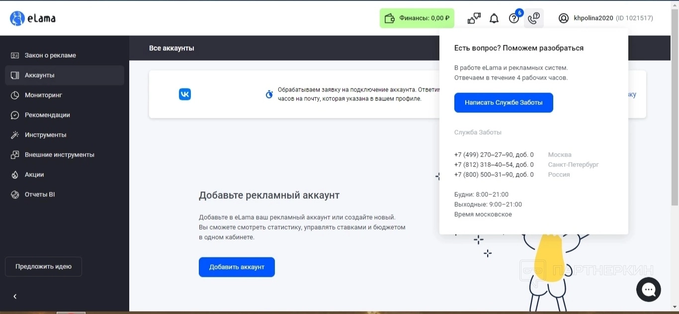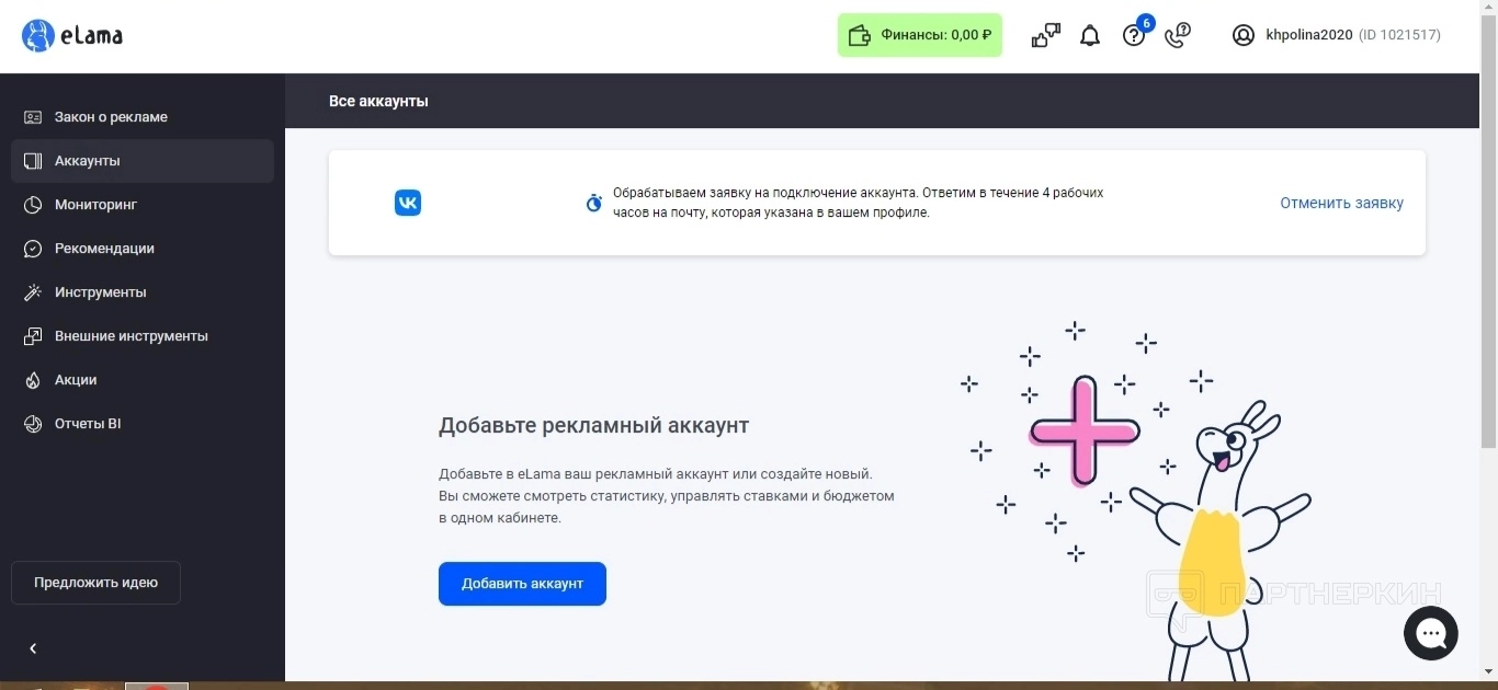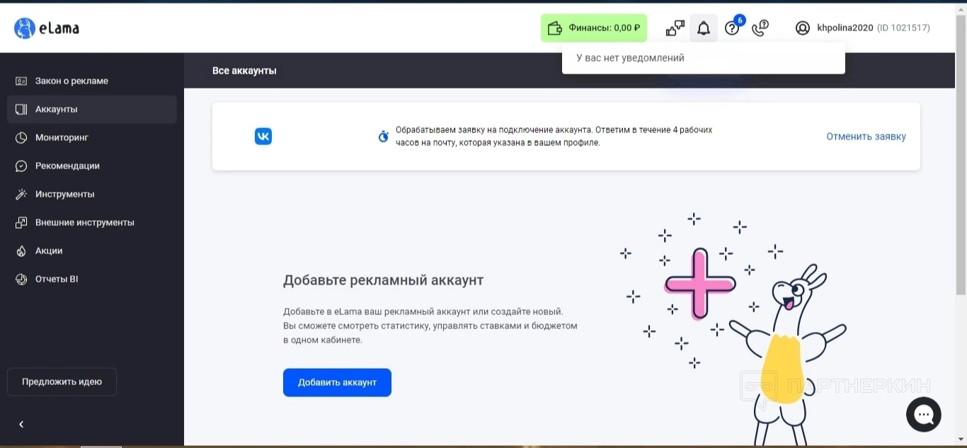 Чтобы начать работу с любым инструментом или услугой, в первую очередь требуется добавить аккаунт. При добавлении появляется информационное окно о том, что результат заявки придет на указанную при регистрации почту в течение 4 рабочих часов.
