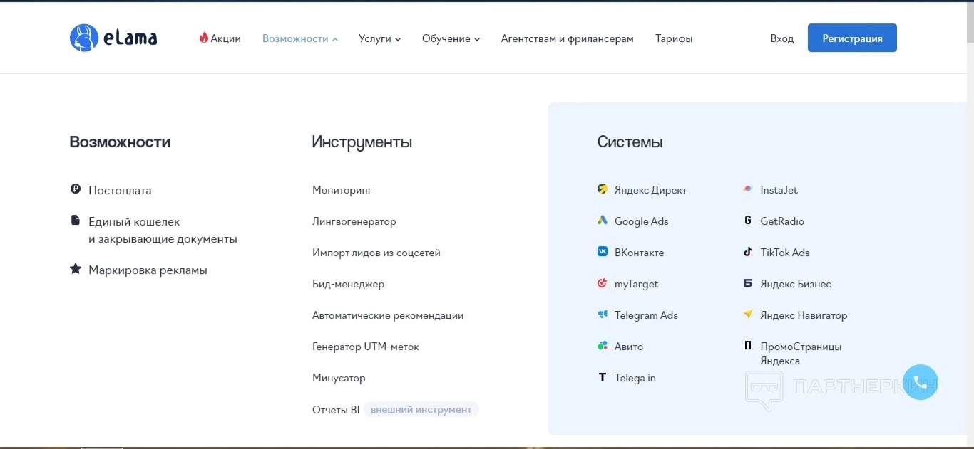 Вторым разделом идут сами Возможности сервиса. Раздел имеет много подразделов, а также здесь собраны все рекламные сети и площадки, с которыми можно взаимодействовать через