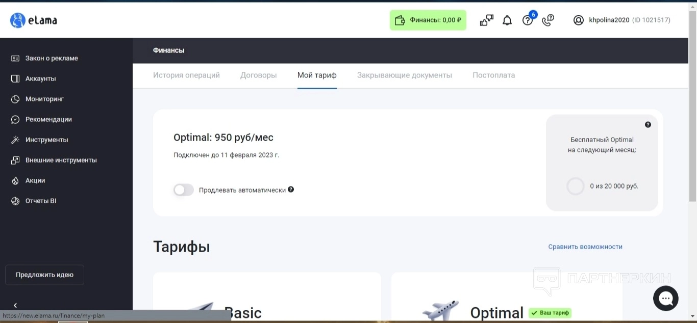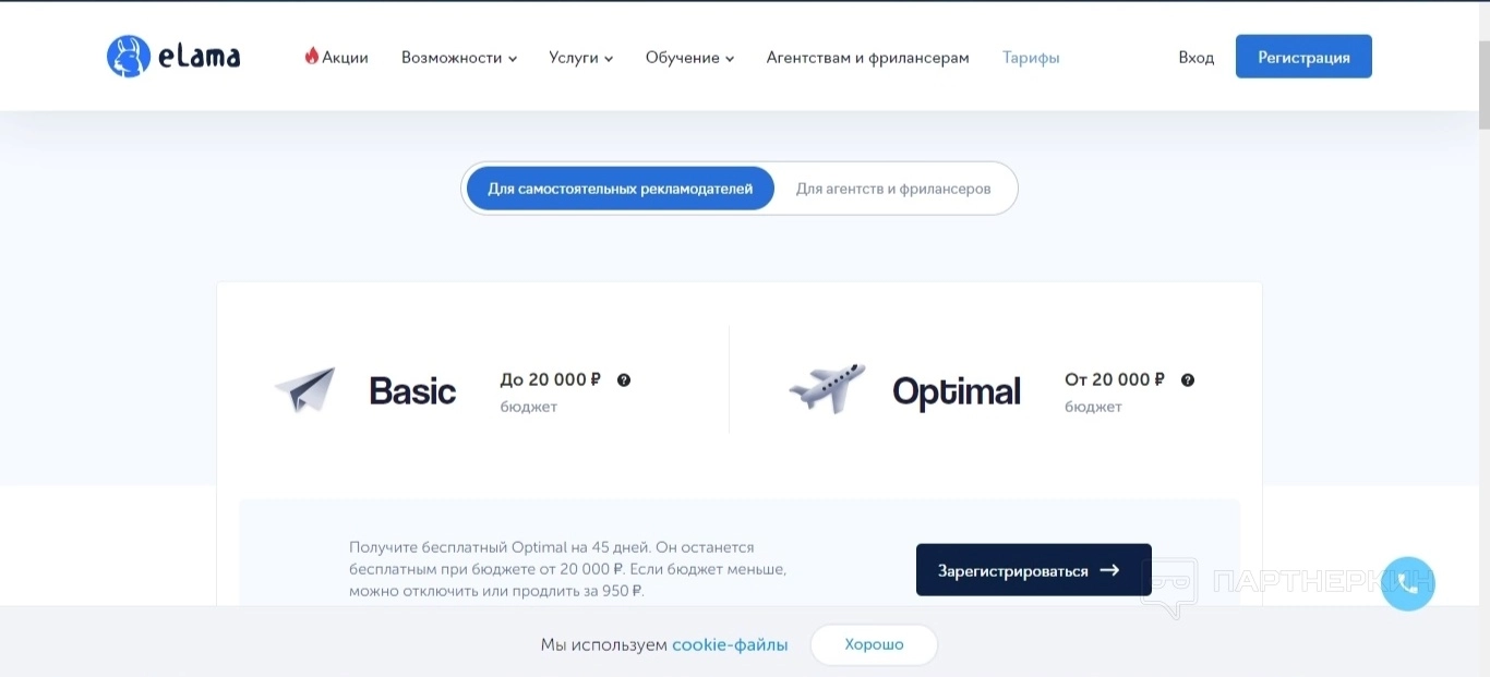 Раздел Тарифы отвечает за предоставление пользователям информации о действующих тарифных планах сервиса. Создатели заявляют, что сервис для всех бесплатный, однако есть некоторые тонкости. Тариф Basic, при котором бесплатный доступ к инструментам будет действовать бессрочно, работает с бюджетом до 20 000 рублей. Тариф Optimal уже будет иметь ограничения по сроку действия: 45 дней после регистрации бесплатно, затем 950 рублей в месяц.