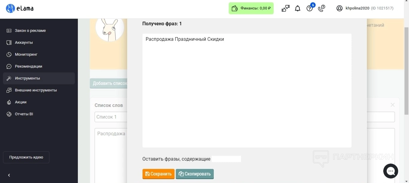 - Минусатор — позволяет настроить ключевые слова и фразы, а затем отследить те, которые будут не ликвидны и не принесут результатов. Также можно сразу добавить уже существующие минус-слова.