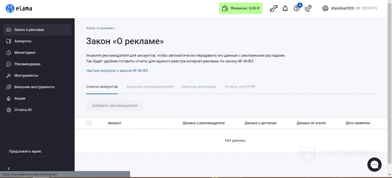 Первым разделом является Закон о рекламе . С 1 сентября 2022 года любая реклама, находящаяся в Интернете должна обязательно маркироваться. Именно поэтому на сайте есть соответствующий инструмент для маркировки, о котором говорилось выше. В данном разделе будет доступна информация о всей маркированной рекламе: какая находится в работе, а какая нет, различные отчеты и так далее.