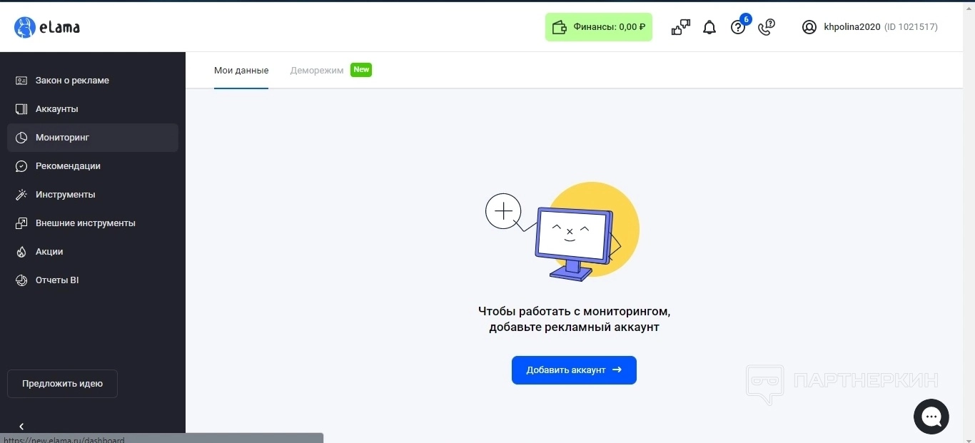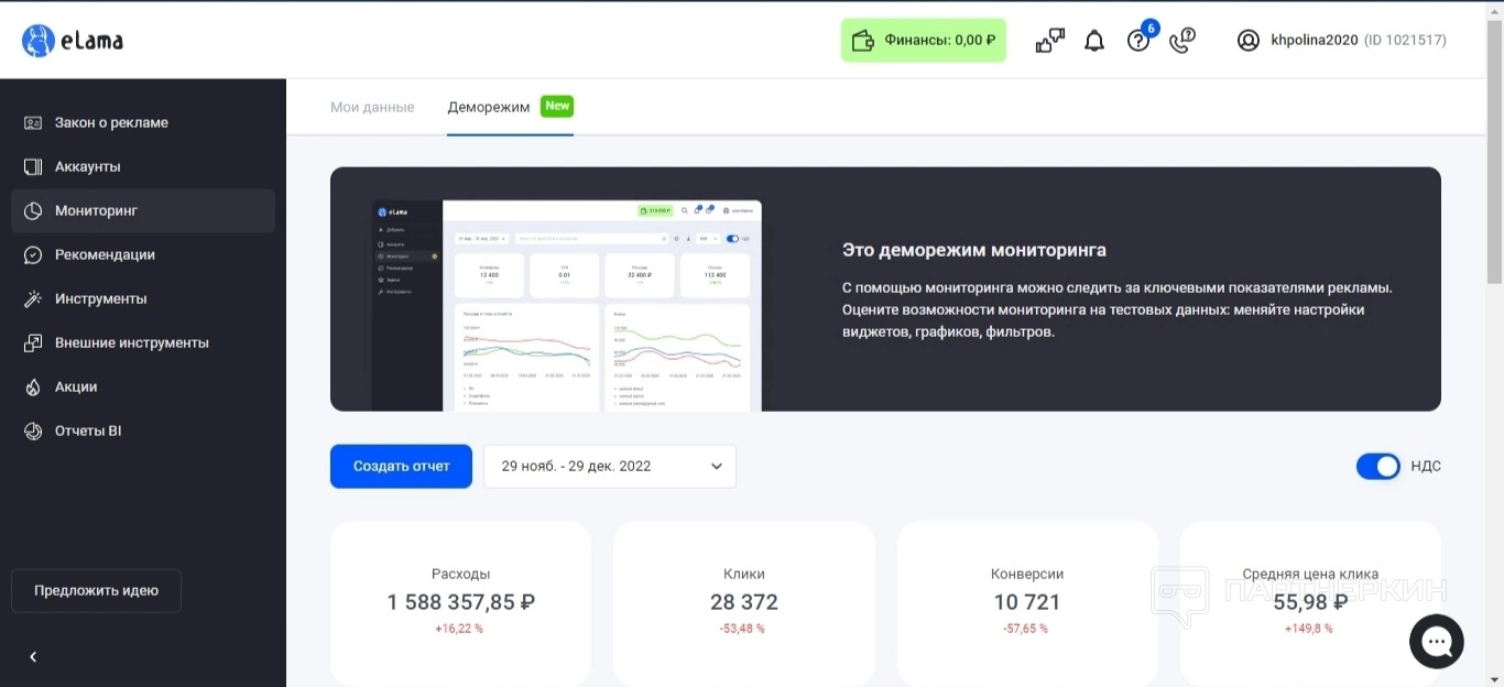 Для начала выберем интересующий раздел и нажмем на него. Для тестирования мы взяли такой инструмент как демо-версия мониторинга рекламной кампании.