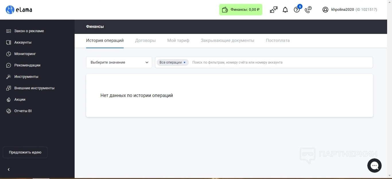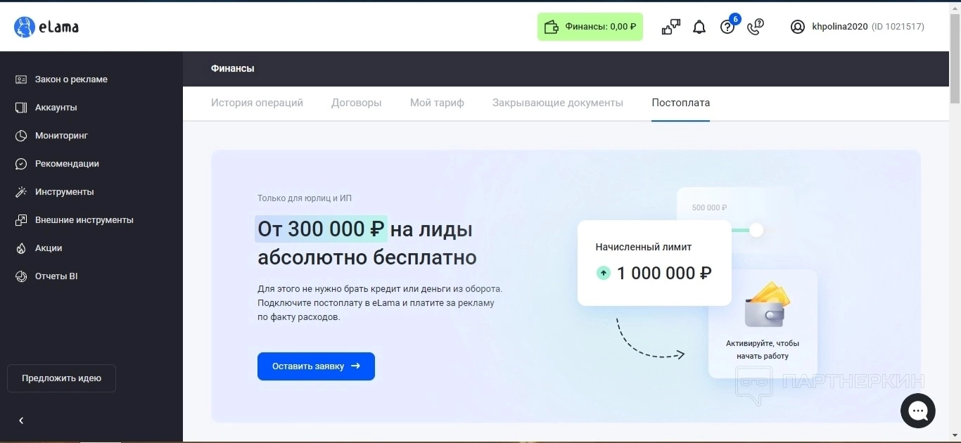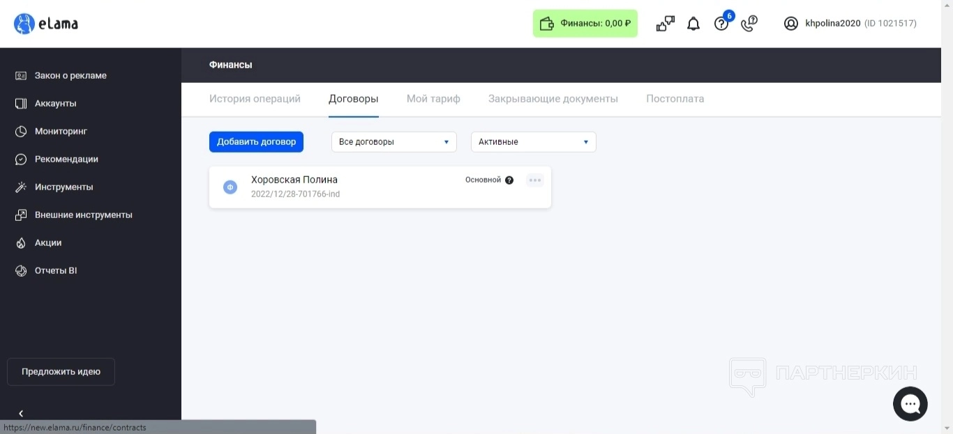 В разделе Договоры создается специальный документ, благодаря которому и осуществляется пополнение баланса профиля. В документе основная информация о плательщике (ФИО, контактные данные и тому подобное). Нужно это для того, чтобы после проведения финансовых операций в отчетах отражалось имя, которое совершило ту или иную операцию. Пока не будет создан договор — пополнить баланс будет невозможно. Минимальная сумма для пополнения — 1 200 рублей.