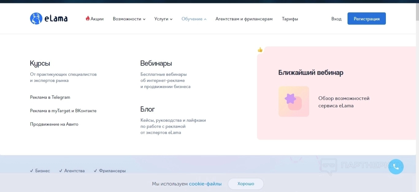 Раздел Обучение содержит в себе несколько подразделов с платными и бесплатными учебными материалами. В нем есть курсы, вебинары и блог, содержащий полезные и интересные статьи как для новичков, так и уже опытных пользователей. Здесь же пользователей информируют о ближайшем вебинаре и его тематике.