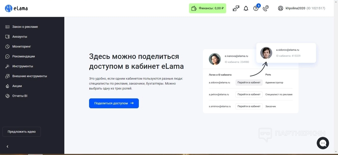 В разделе Поделиться доступом можно делиться доступом в свой аккаунт с другими пользователями. Это значит, что они будут иметь такой же список инструментов, как и вы. Баланс также будет доступен этим пользователям. Именно поэтому и создаются договора с персональными данными, чтобы в дальнейшем было видно, кто сколько на что потратил.