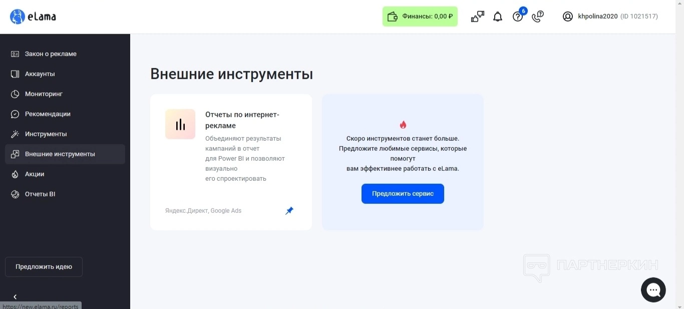 Во Внешних инструментах находятся в основном отчеты по интернет-рекламе в таких рекламных сетях как Google Ads и Яндекс.Директ.