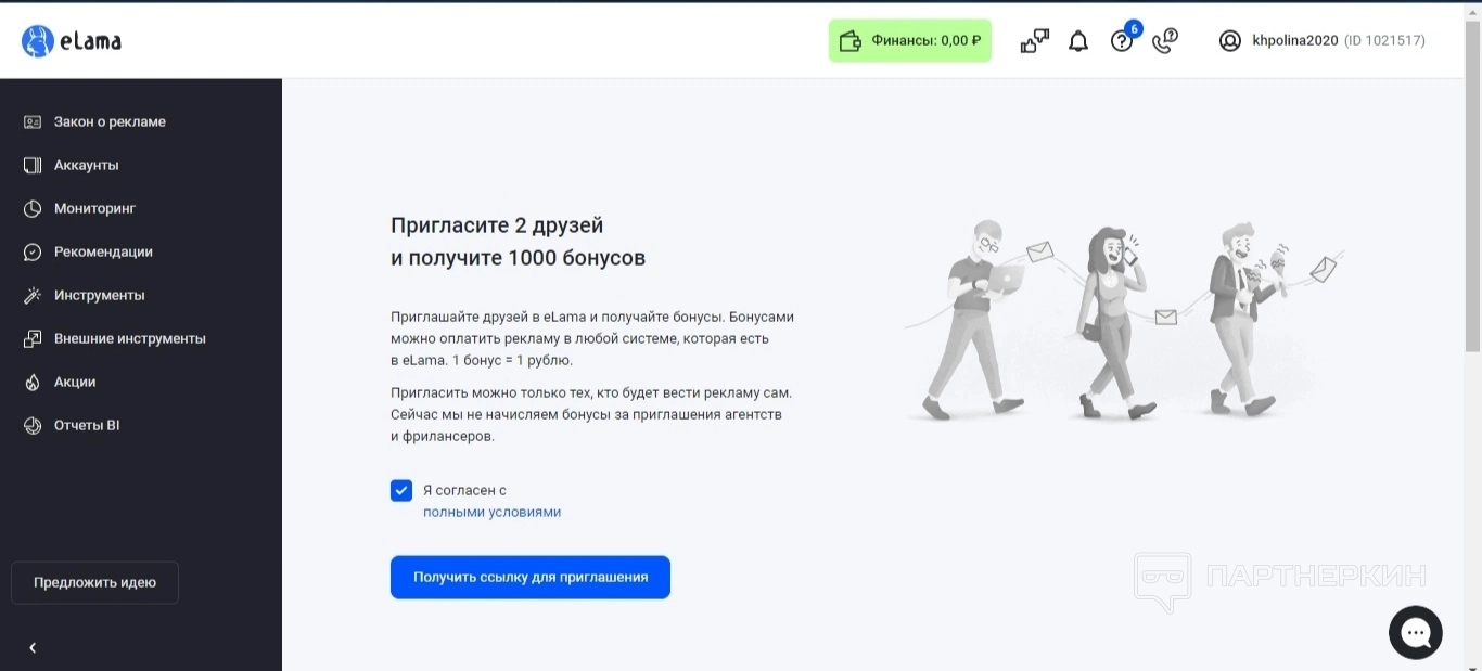 В разделе Пригласи друга находится интересная бонусная программа, участвуя в которой можно зарабатывать бонусы, приглашая своих друзей. 1 бонус можно конвертировать в 1 рубль, а затем расплачиваться ими в самом сервисе. Приглашать можно только тех друзей, которые будут самостоятельно заниматься рекламными кампаниями, на юридических лиц и фрилансеров бонусная программа не распространяется.